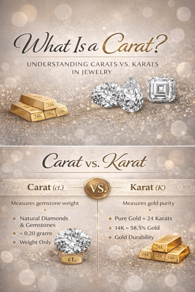 If you’ve ever shopped for a diamond ring or fine jewelry, you’ve probably heard the terms carat and karat. Although they sound the same, they mean completely different things in the jewelry world.