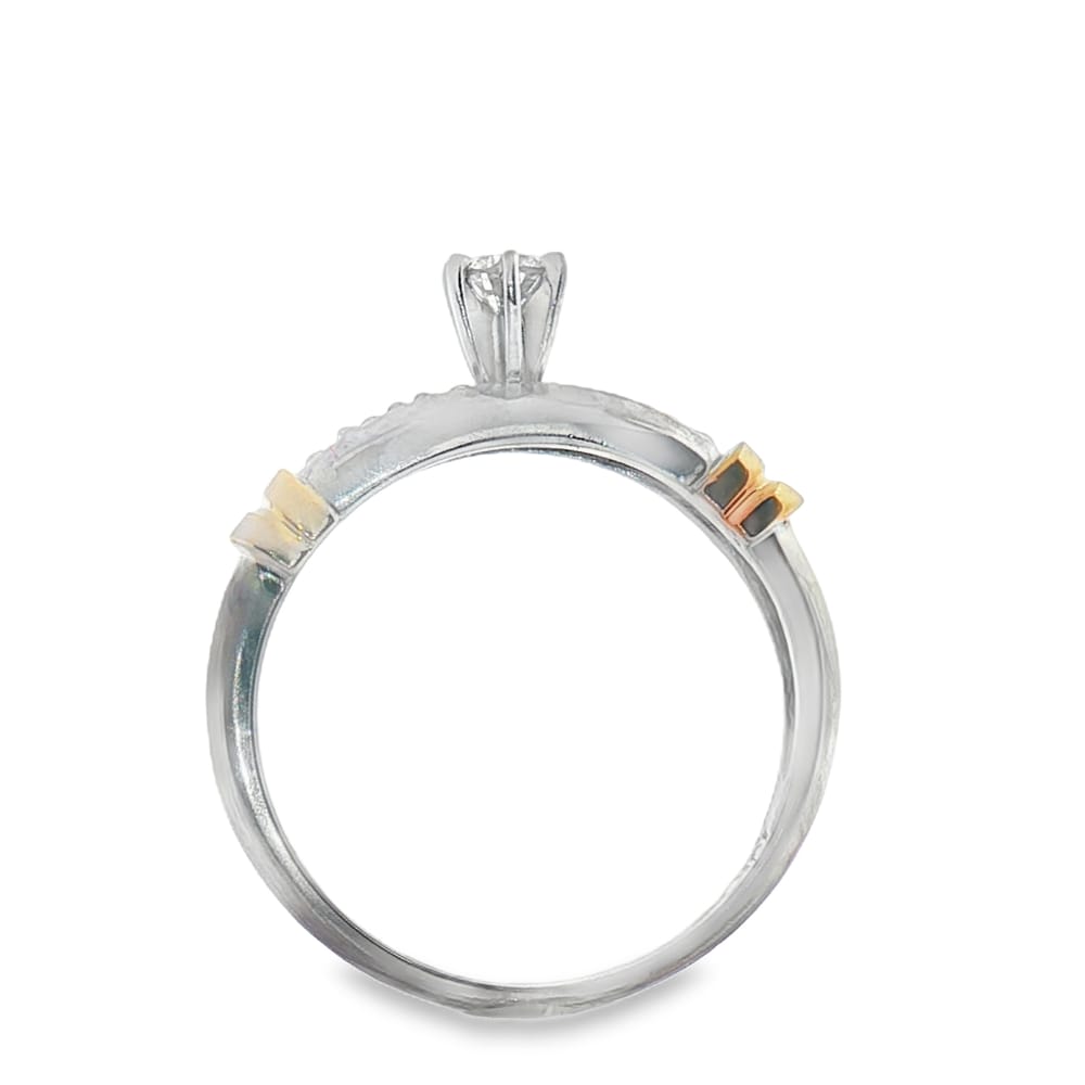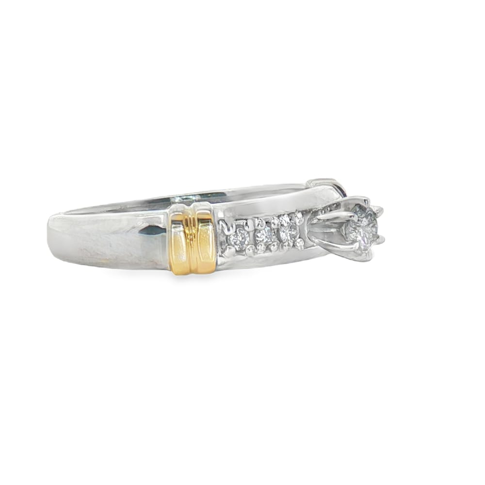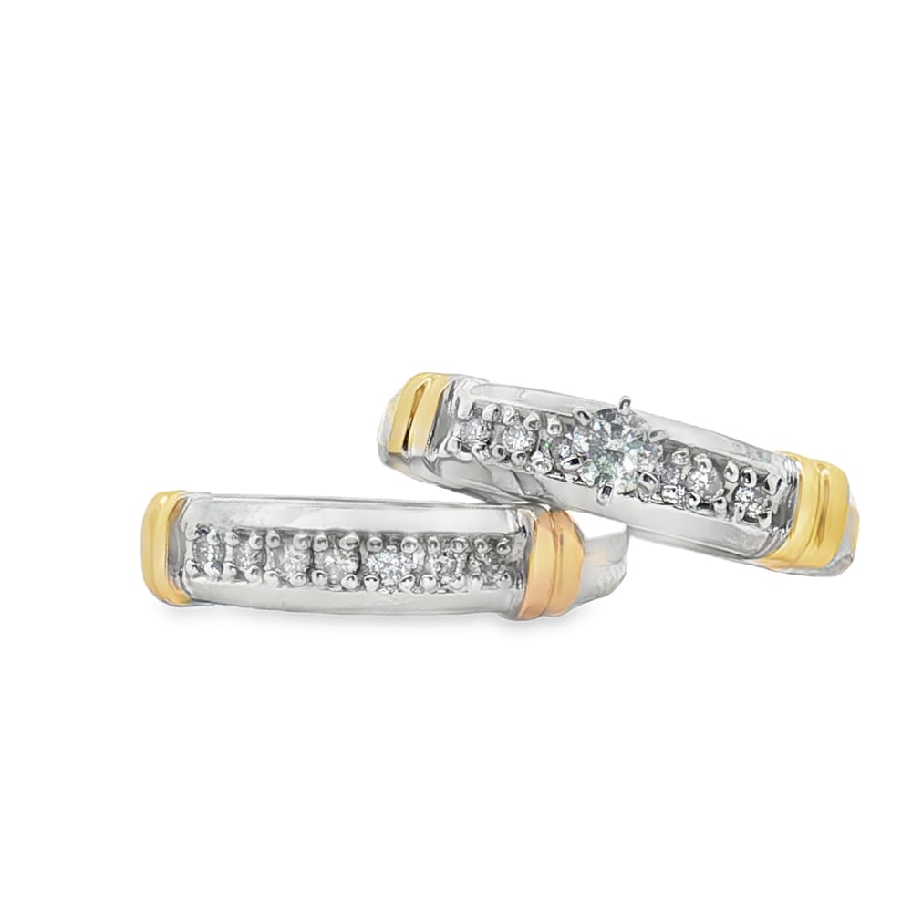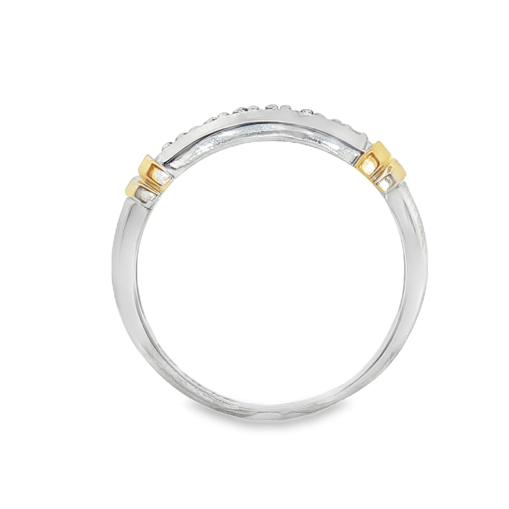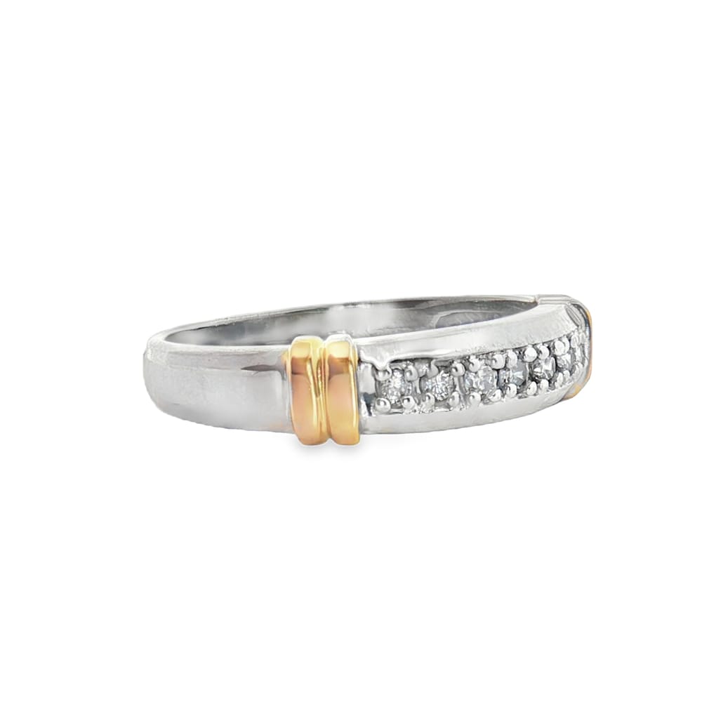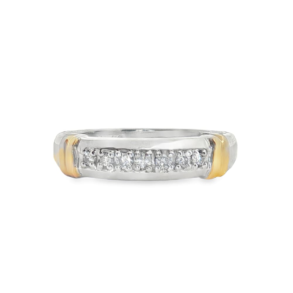 This exquisite women’s wedding band features a stunning combination of white and yellow 10K gold, elegantly adorned with round diamonds. Weighing 5.27 grams, this piece boasts a total carat weight of 0.54, showcasing a captivating round center stone accompanied by 13 brilliant side stones. Perfect for commemorating your special moments, this ring blends timeless design with luxurious sparkle.
