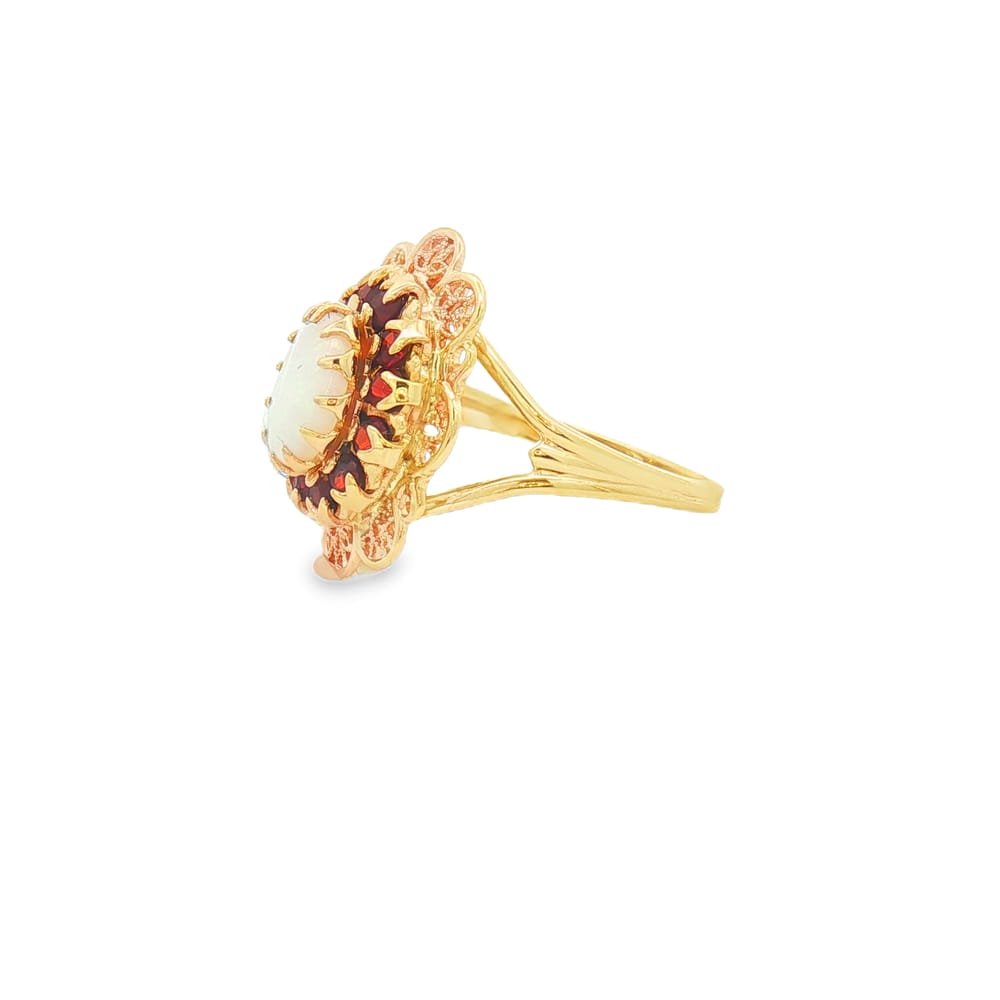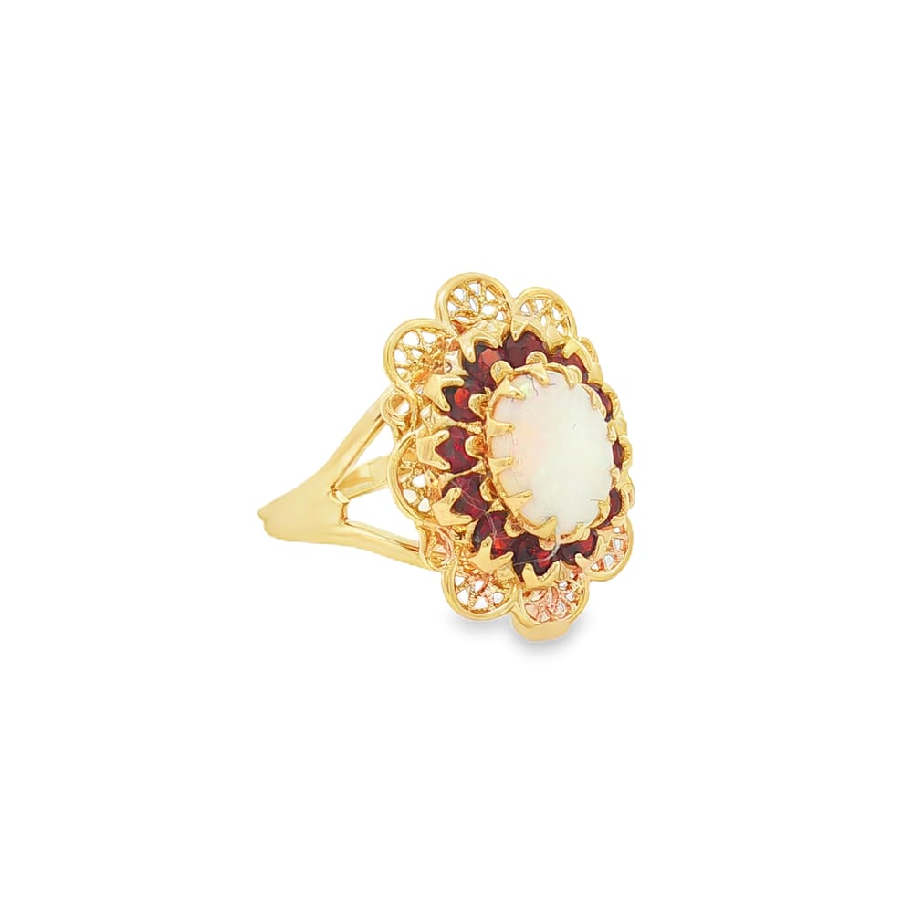 This exquisite ring features a captivating oval opal as the centerpiece, elegantly complemented by garnet side stones. Crafted from luxurious 10K gold, it’s a perfect accessory for any occasion, embodying both sophistication and charm.