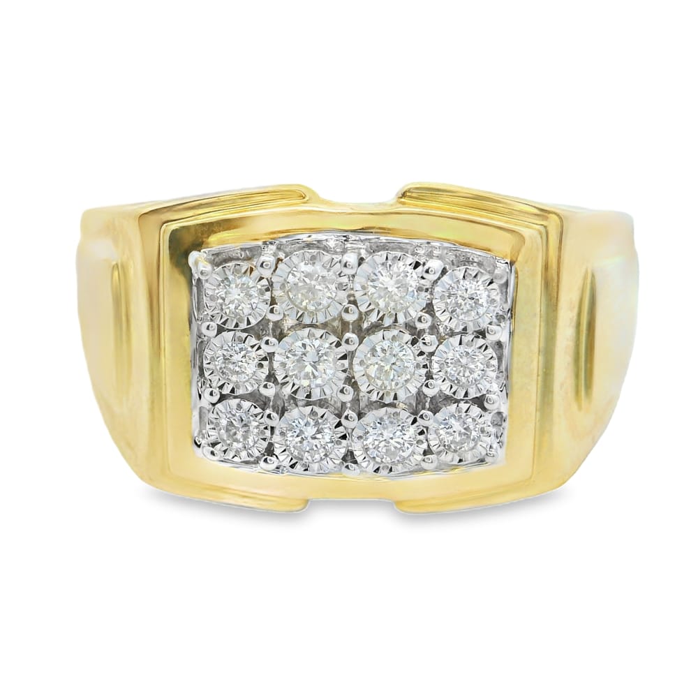 Elevate your accessory collection with this classic men’s ring, beautifully crafted in 10K yellow gold. Featuring 12 dazzling diamonds totalling .20ct, this piece embodies timeless elegance and sophistication, perfect for any occasion.
