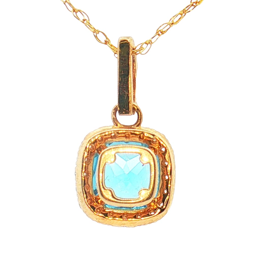 This exquisite pendant showcases a vibrant blue topaz harmoniously complemented by .19ct of shimmering diamonds. Crafted from luxurious 14K yellow gold, it adds a touch of elegance to any ensemble.