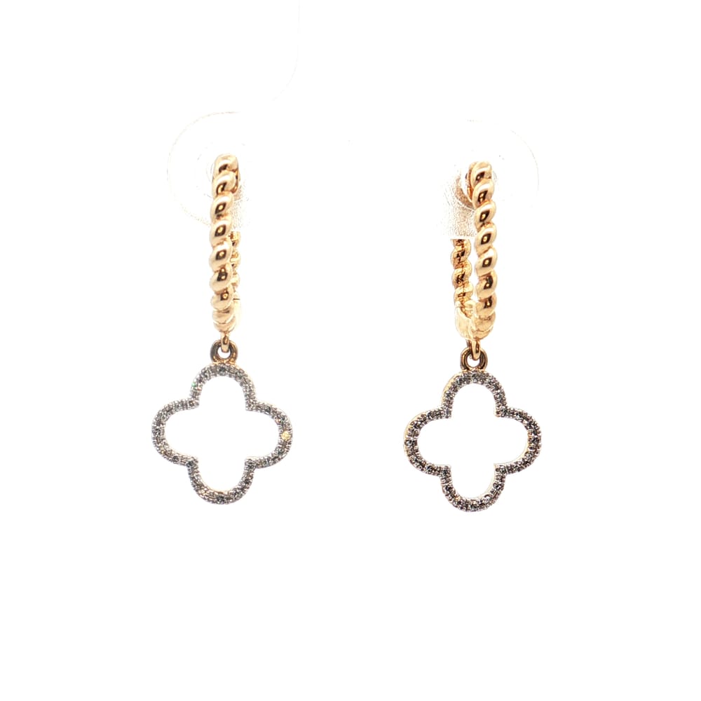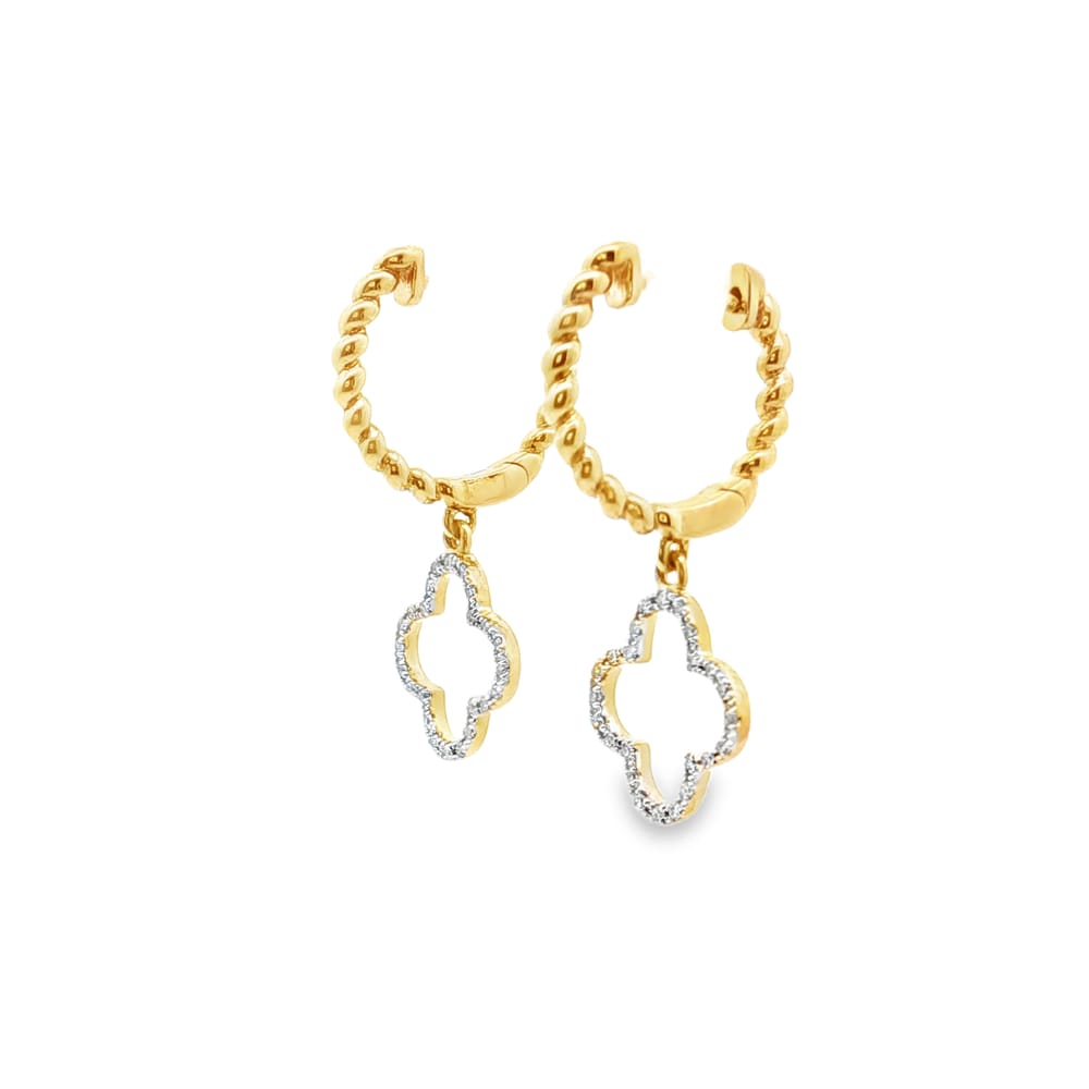 Elevate your style with these exquisite 14K Gold earrings featuring a delightful four-leaf clover design embellished with radiant diamonds. Perfect for adding a touch of elegance to any outfit, these gorgeous drop earrings are a charming accessory for any occasion.