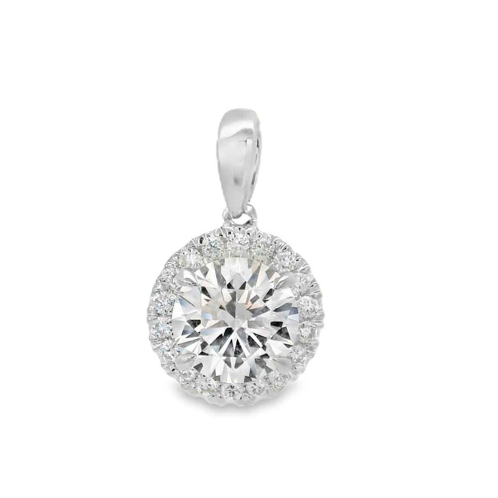This elegant pendant features a central round lab-grown diamond, weighing 1 carat and showcasing an exquisite F color with VS1 clarity. Accented by 18 side diamonds totaling 0.14 carats, this piece is a timeless addition to any jewelry collection, crafted for women who appreciate classic beauty.