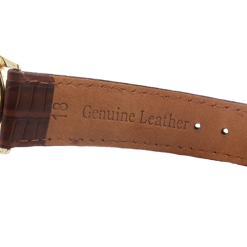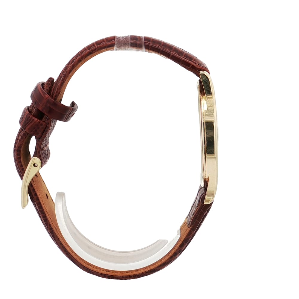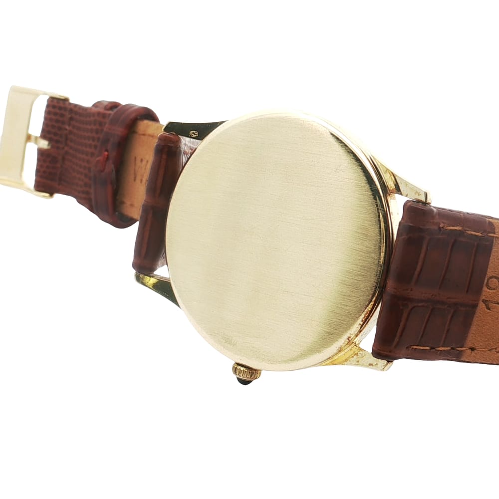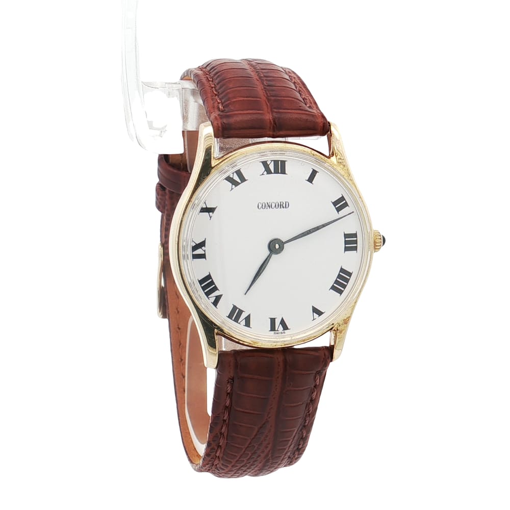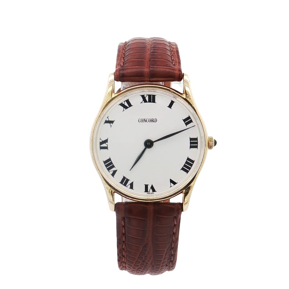 Elevate your wrist game with this exquisite pre-owned Concord watch crafted from luxurious 14K gold. Featuring a classic design, this timepiece showcases a gleaming yellow gold case and a stylish white dial that perfectly complements its brown leather strap. Experience the sophistication of Concord with precise movement and timeless elegance, making it an ideal accessory for any gentleman.
