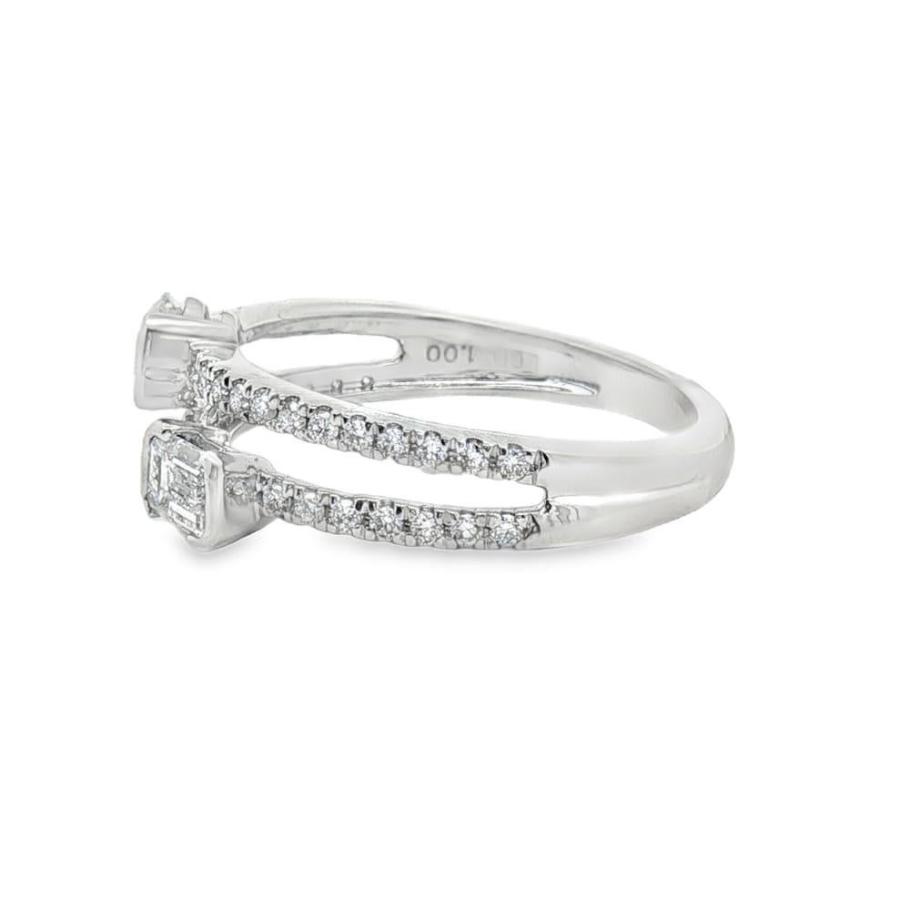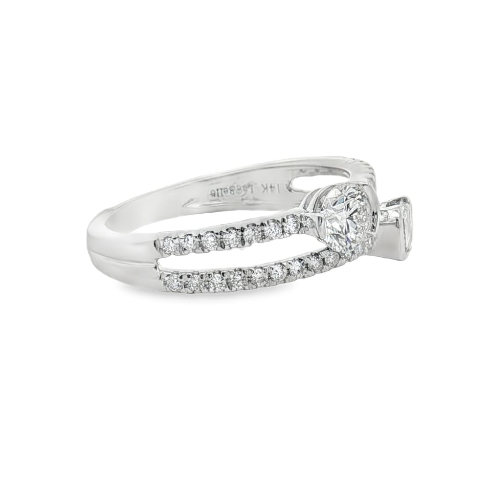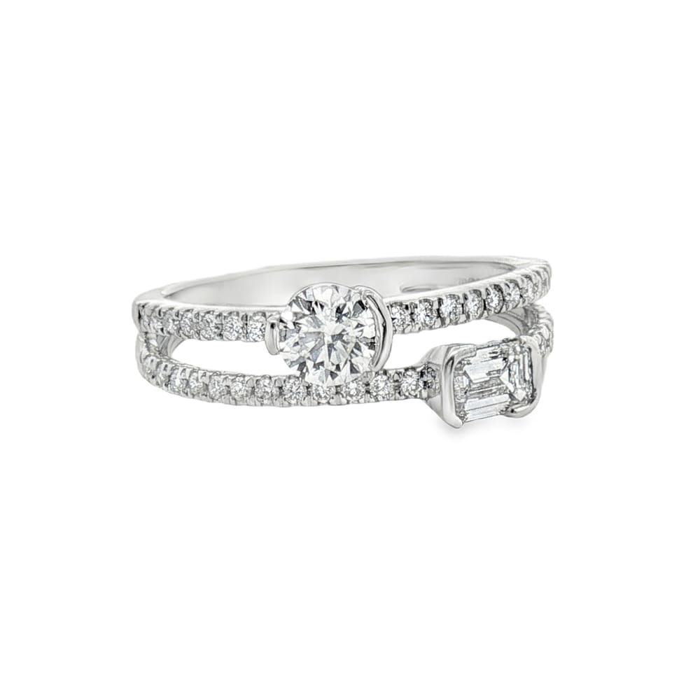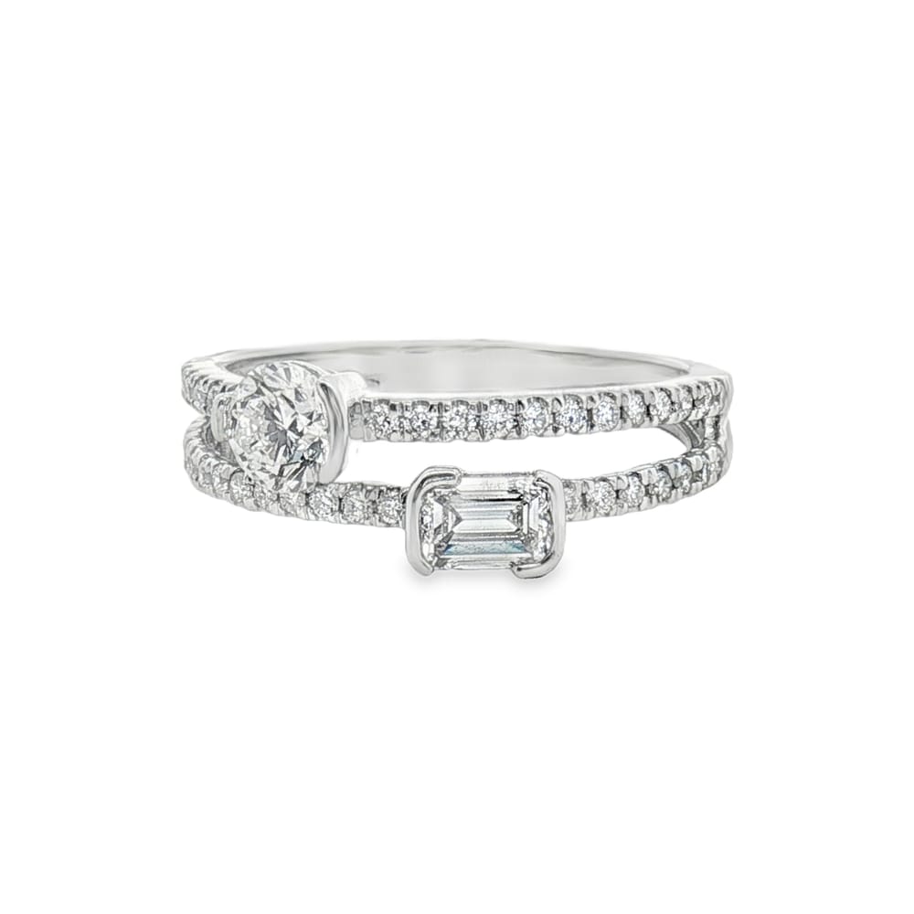 Discover the enchanting blend of vintage elegance and modern design with this exquisite engagement ring featuring a vibrant lab-grown round and emerald center stone. Surrounded by 38 sparkling round diamonds, this 14K white gold masterpiece is sure to capture hearts. Perfect for the discerning woman, it is a timeless symbol of love and commitment.