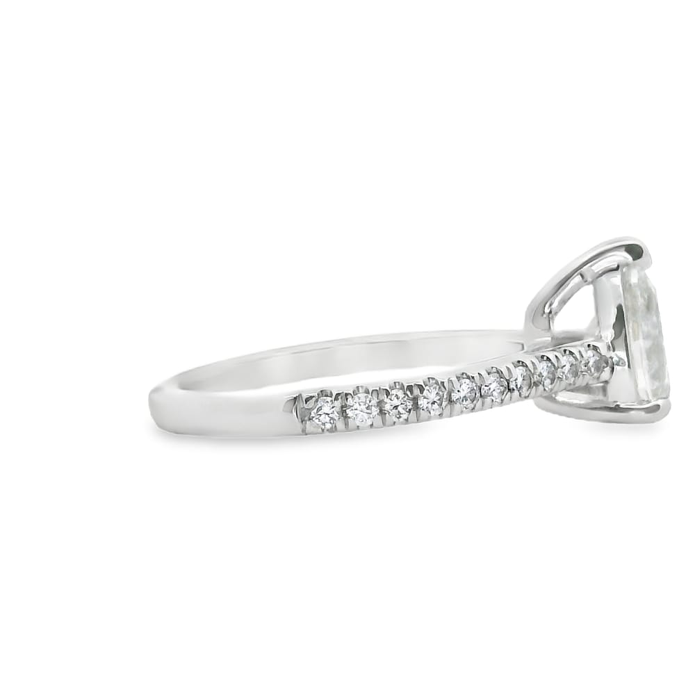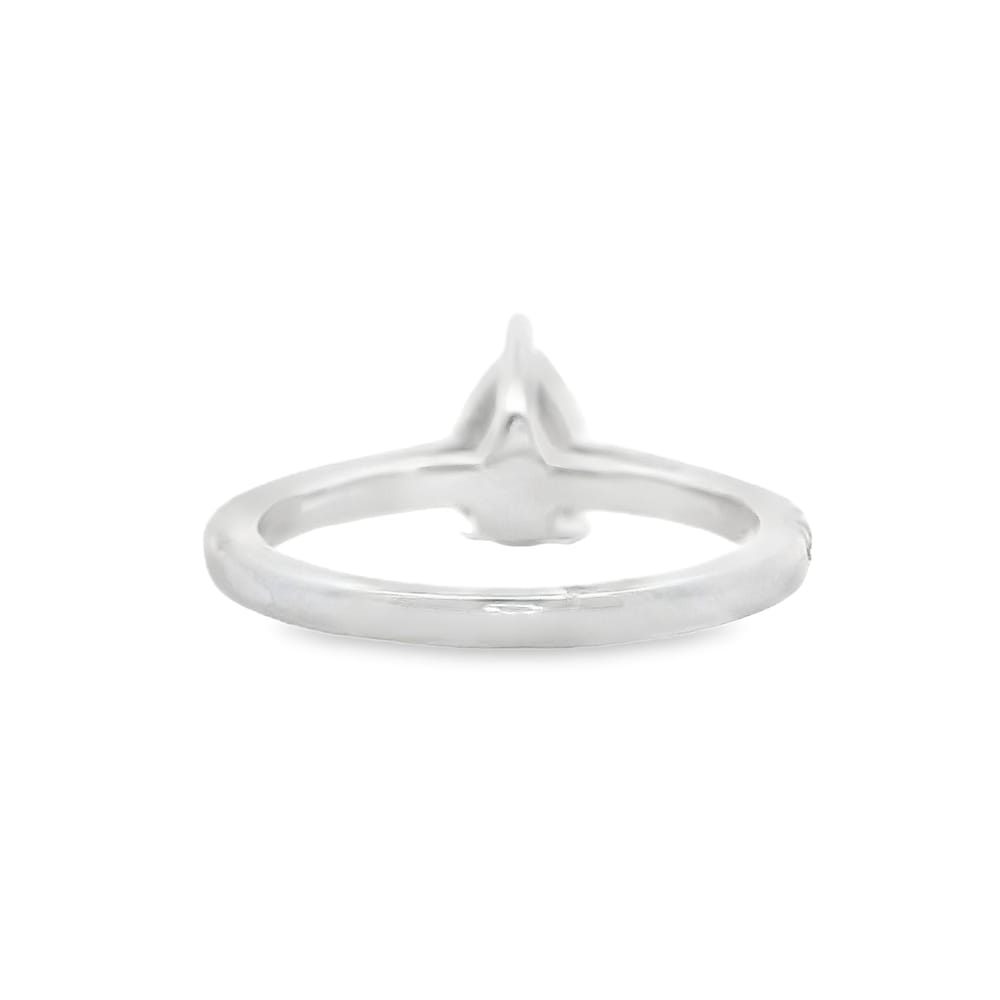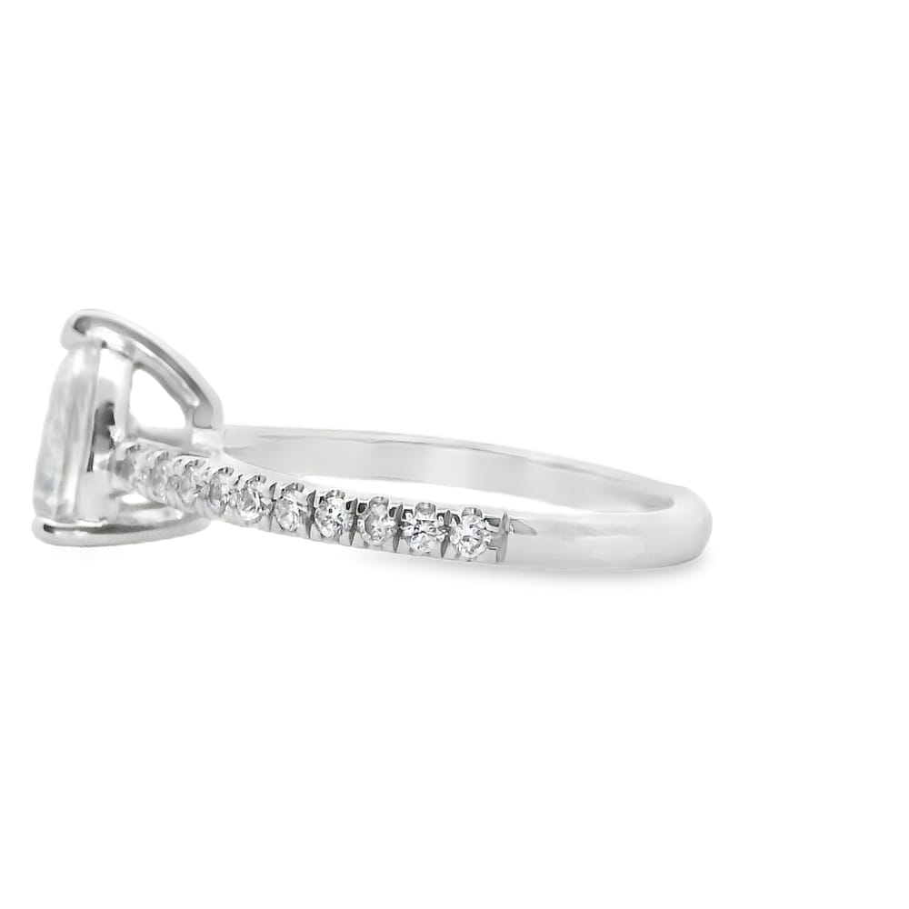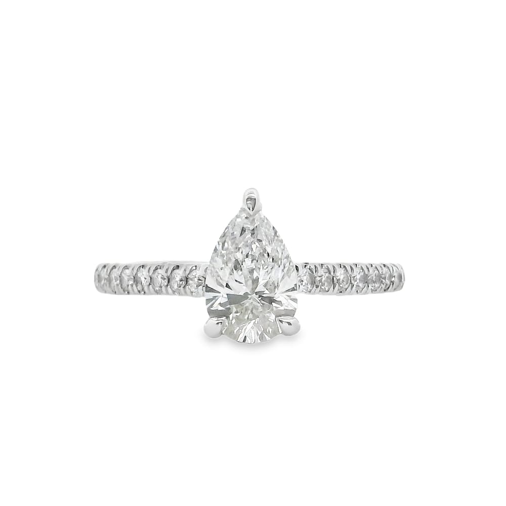 This exquisite engagement ring features a lab-grown pear-shaped center stone weighing 0.99 carats, showcasing a bright F color and clarity of VS1. Surrounding the stunning center, a total of 0.27 carats of side diamonds elevate the ring’s elegance, making it a remarkable choice for the modern woman.