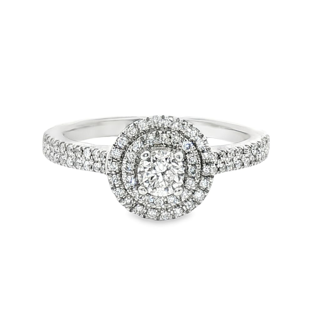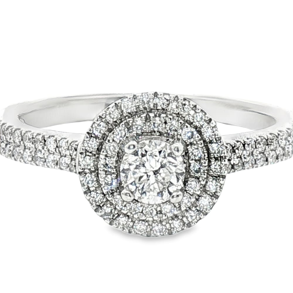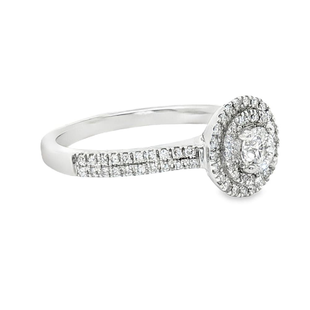 This exquisite engagement ring features a brilliant round center diamond of 0.24 ct, elegantly encircled by a double halo of 78 sparkling round diamonds totaling 0.20 ct. Crafted in luxurious 14K gold, its radiant design is perfect for the modern woman ready to say “I do.” With a gross weight of 3.05 grams, this ring embodies both sophistication and timeless beauty, making it an unforgettable symbol of love.