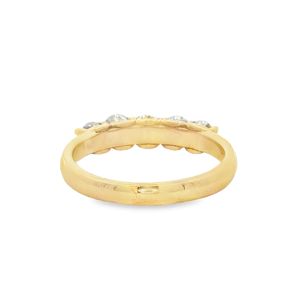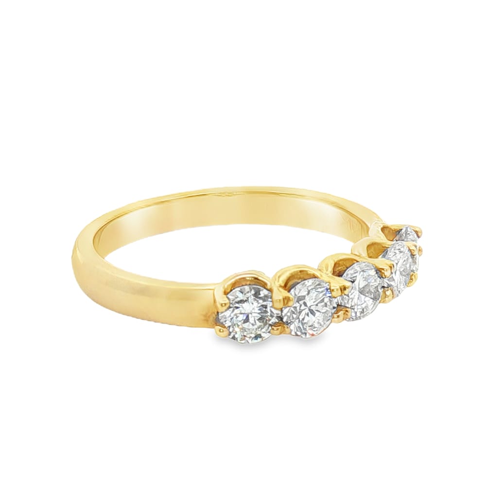 This exquisite women’s wedding band features five dazzling round diamonds, adding a touch of elegance to any special occasion. Crafted from luxurious 14K yellow gold, it radiates warmth and sophistication. With a total weight of 0.90 carats, this ring is the perfect symbol of love and commitment.
