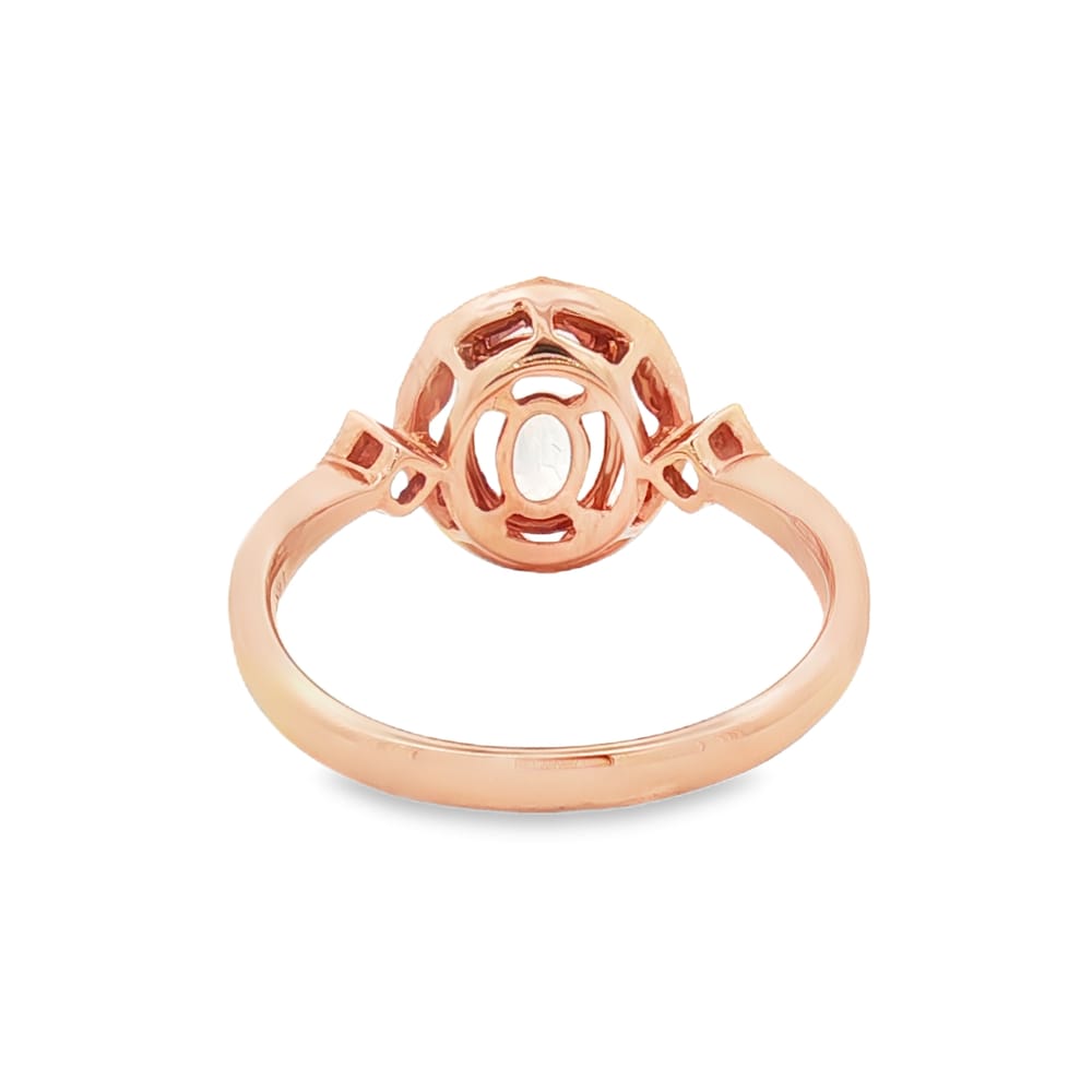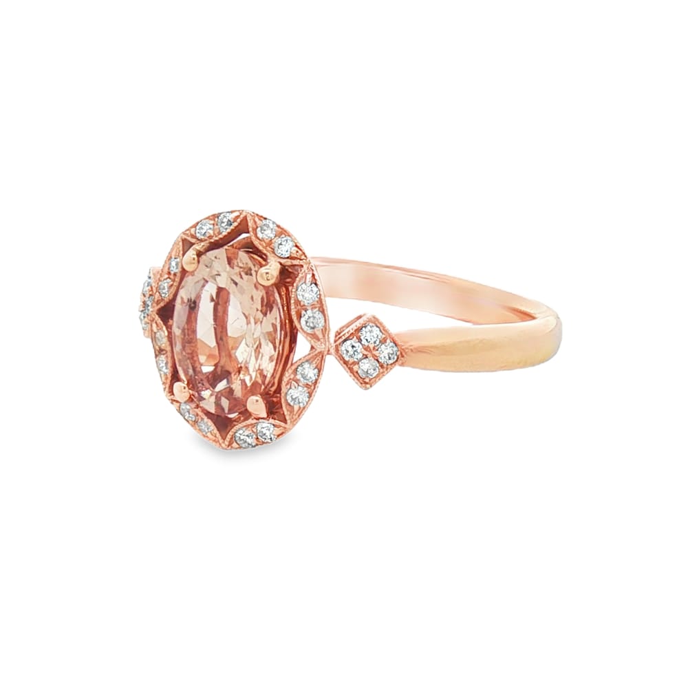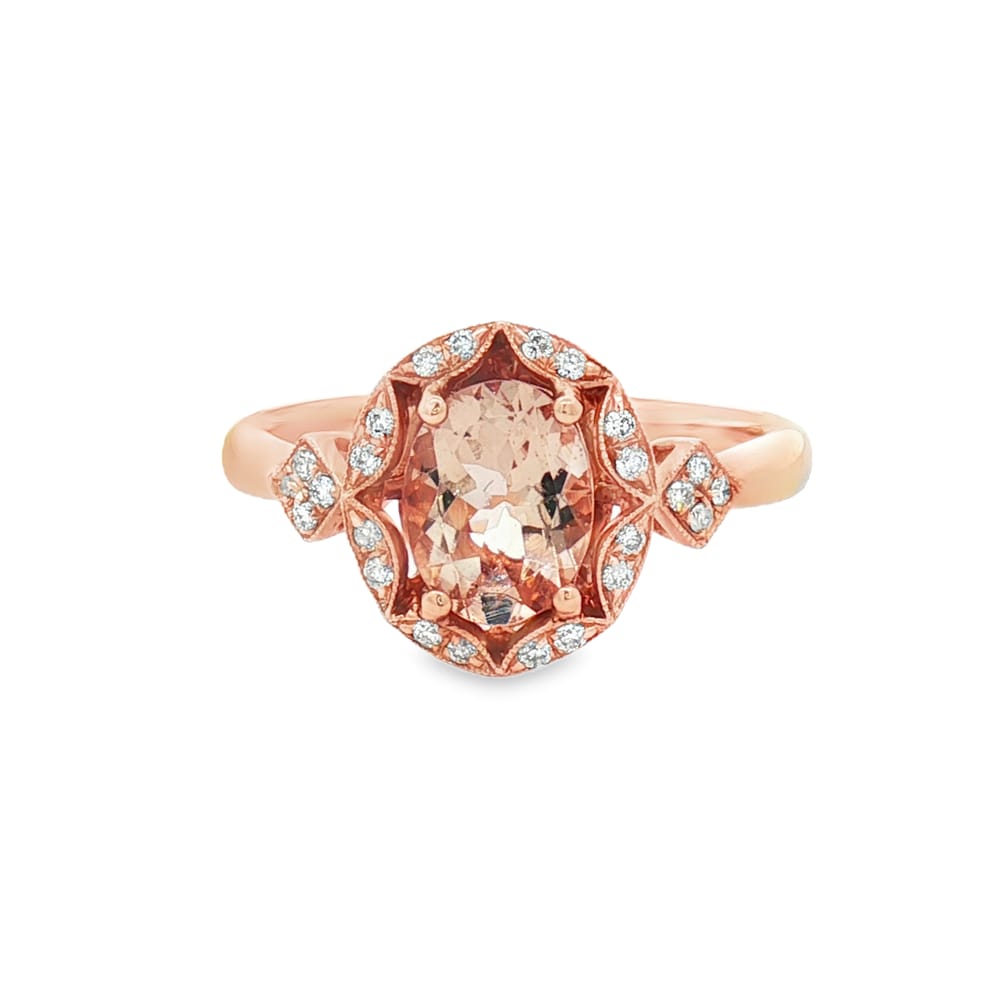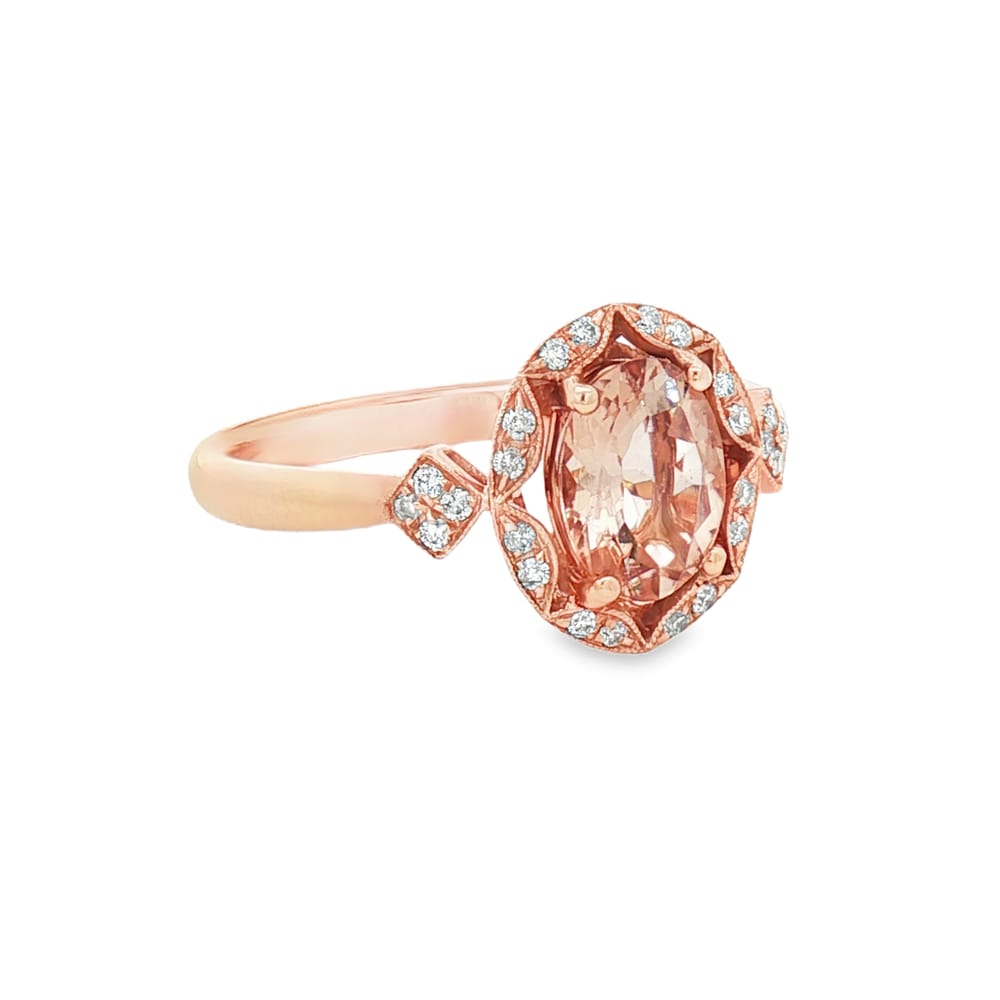 This exquisite ring features a gorgeous oval Morganite center stone, weighing 2.93 carats, elegantly set in luxurious 14K rose gold. Surrounding the central stone are 24 dazzling round diamonds totaling 0.13 carats, adding a touch of sparkle to this enchanting piece. Perfectly designed for women, this ring is a splendid choice for any occasion or as a timeless gift.