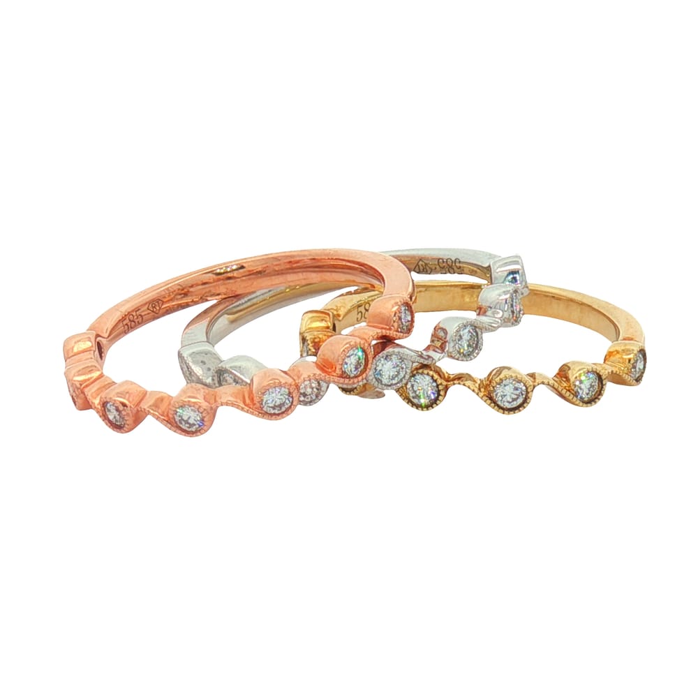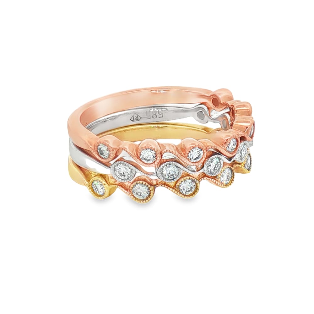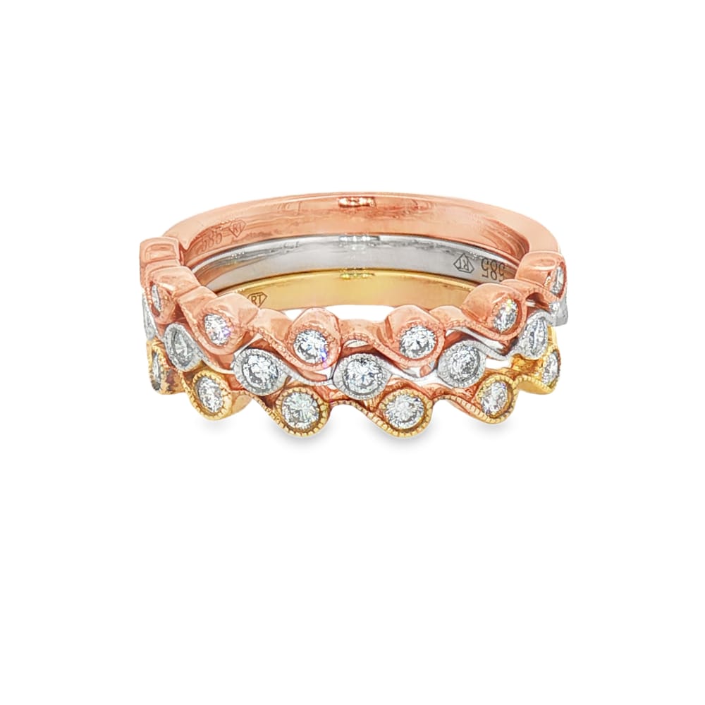 This exquisite 14K gold stackable diamond ring set is designed for women who appreciate versatility. Featuring a combination of white, yellow, and rose gold, this set includes 21 round diamonds with a total weight of 0.51 carats, showcasing their brilliance in every angle. Ideal for any occasion, these rings can be worn individually or together for a chic layering effect.