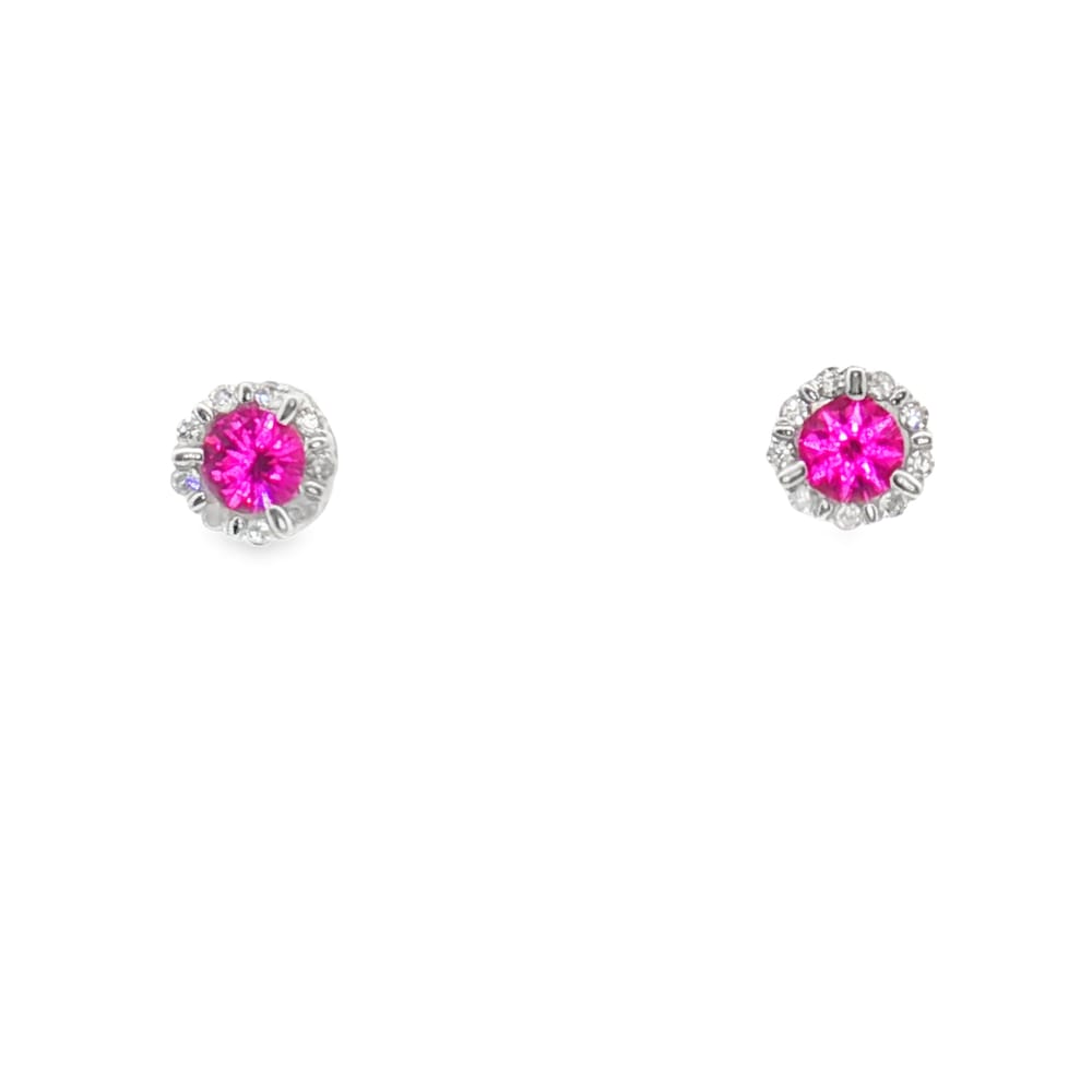 Add a touch of romantic elegance to your collection with these 14K White Gold Pink Sapphire and Diamond Earrings. Each earring features a captivating 3mm pink sapphire, radiating a soft yet vibrant hue that exudes femininity and charm. Surrounding the center stones are a total of 18 round-cut diamonds, totaling 0.05 carats, adding a brilliant sparkle to the design. Crafted in lustrous 14K white gold these earrings combine timeless beauty with lightweight comfort. Perfect for special occasions or adding a pop of color to your everyday look, these earrings are a celebration of refined sophistication.
