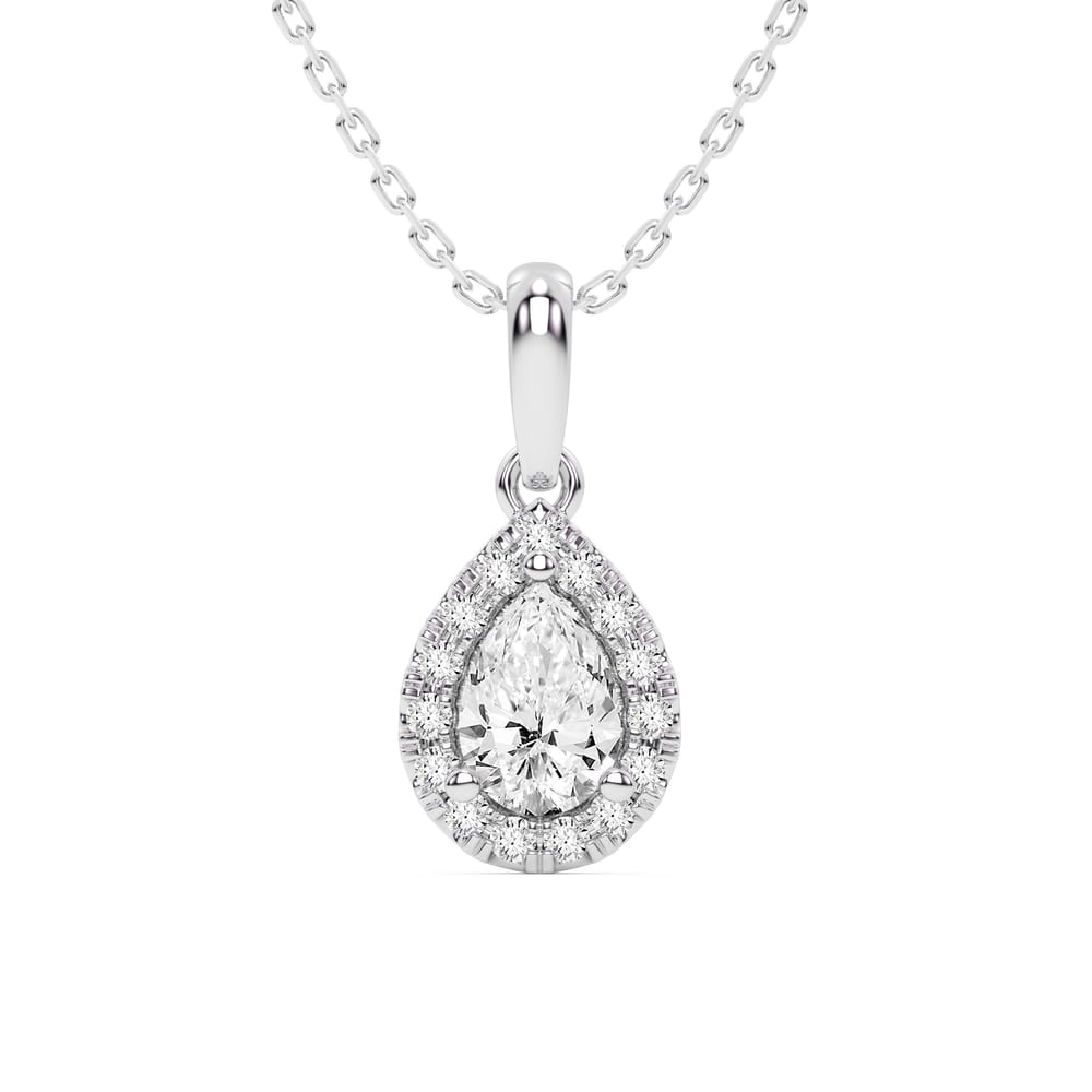 This elegant pendant features a lab-grown pear-shaped .50ct diamond combined with sparkling natural diamonds, creating a captivating look with more lab grown diamonds in a halo. Crafted in 14K white gold, it is perfect for adding a touch of sophistication to any ensemble. *Pendant only*