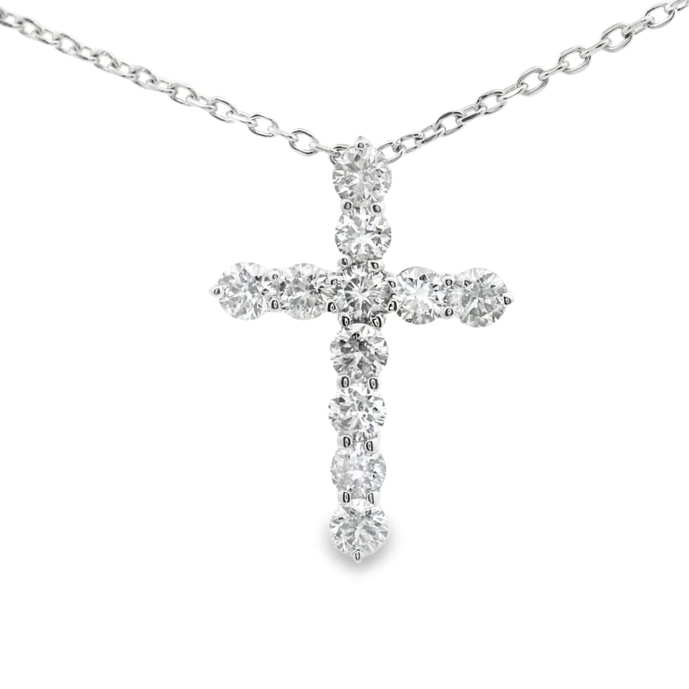 This elegant cross pendant necklace is crafted in radiant 14K white gold and adorned with 11 dazzling diamonds totaling 1.30ct. Perfect for both everyday wear and special occasions, it offers a timeless and sophisticated style that is sure to impress.