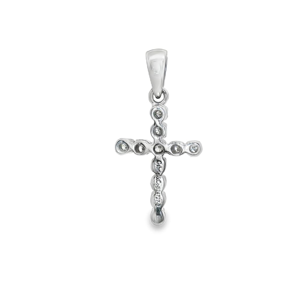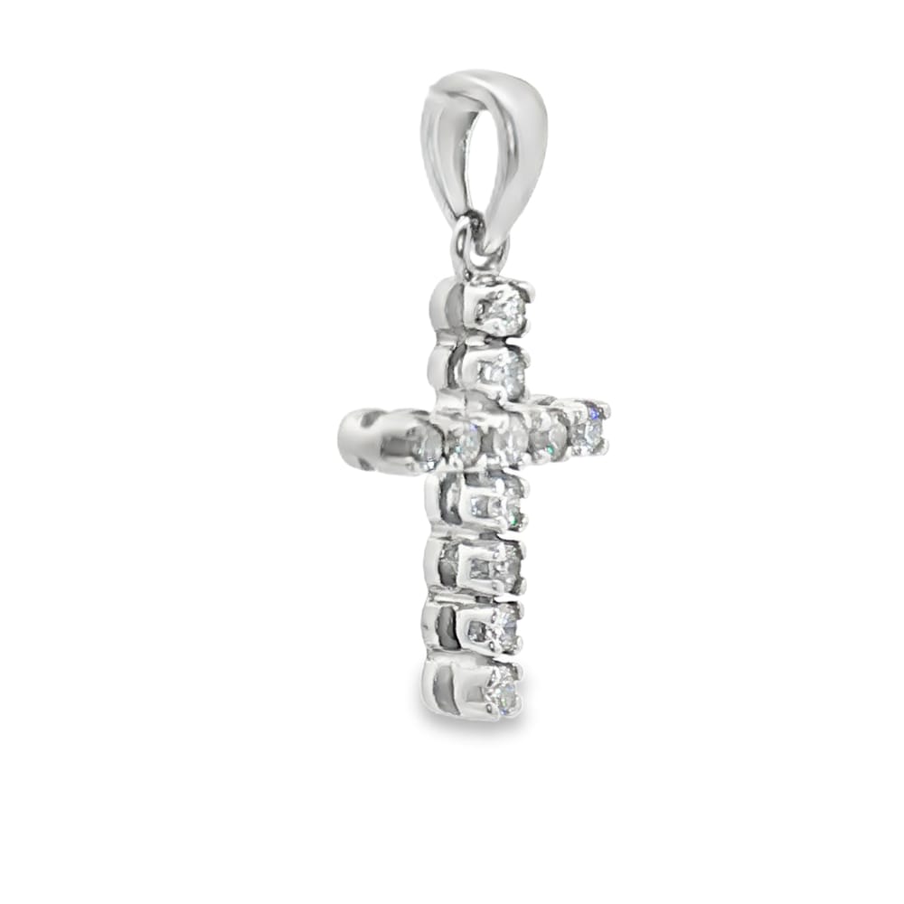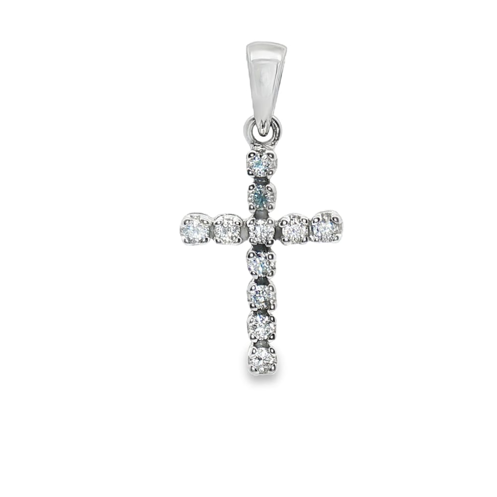 This elegant pendant features a delicate cross design crafted from 14K white gold, adorned with 11 dazzling diamonds. A perfect accessory for those seeking to combine faith and fashion in their jewelry collection.