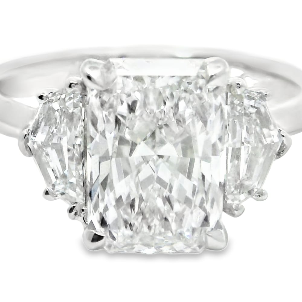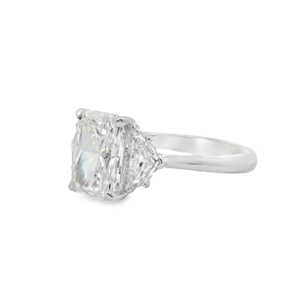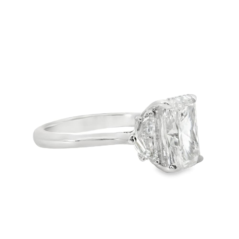 This elegant engagement ring features a radiant lab-grown diamond center stone of 2.25 carats, boasting an F color and VS1 clarity. Surrounding the center, exquisite epaulet cut lab-grown diamonds add an additional .66 carats, beautifully complementing the ring’s brilliance. IGI certified.
