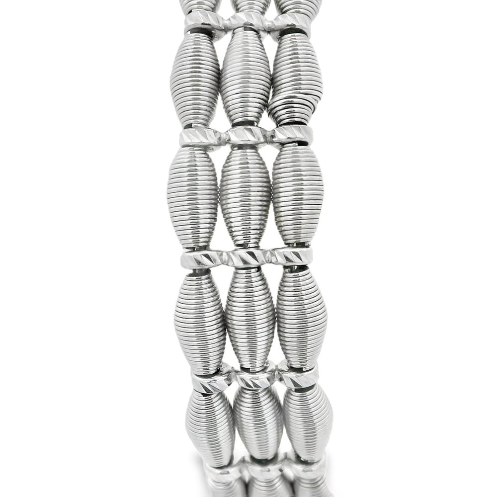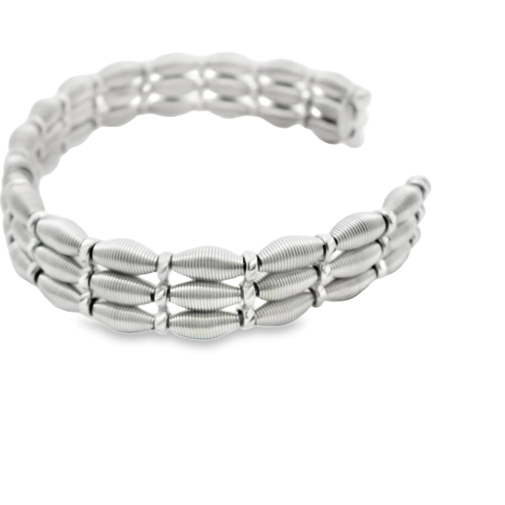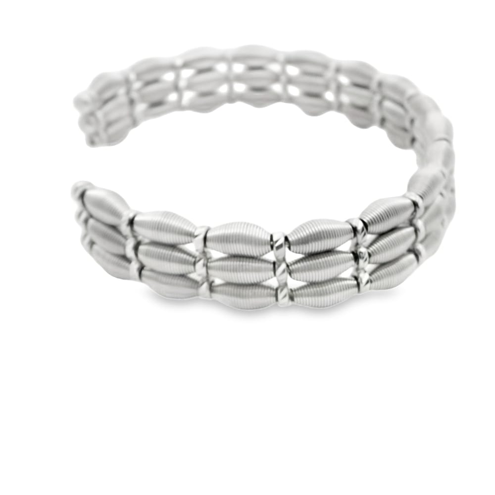 Elevate your style with this exquisite 14K white gold bangle bracelet, featuring a unique three-row barrow shape link design.
