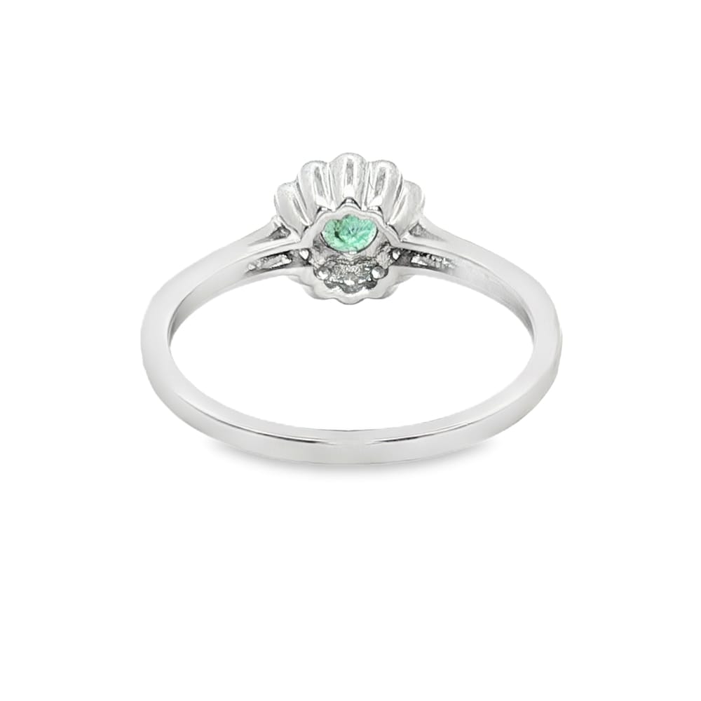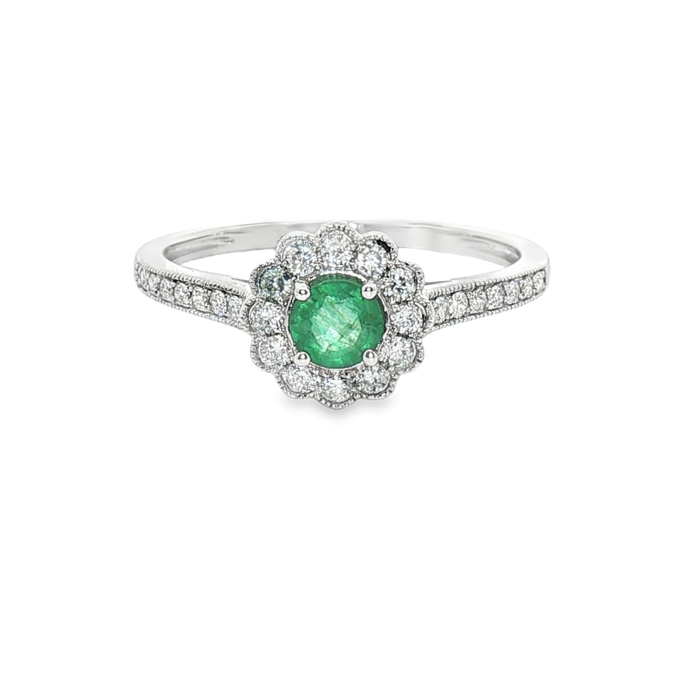This exquisite ring features a captivating round emerald at its center, elegantly set in luxurious 14K white gold. Adorned with 26 shimmering round diamonds, the total weight of the side stones is 0.21 carats, creating a brilliant contrast to the rich green of the emerald. Perfect for women who appreciate fine jewelry, this ring exudes sophistication and charm, making it an ideal choice for any occasion.