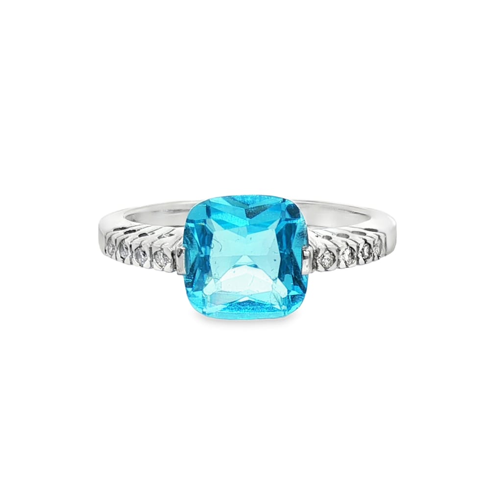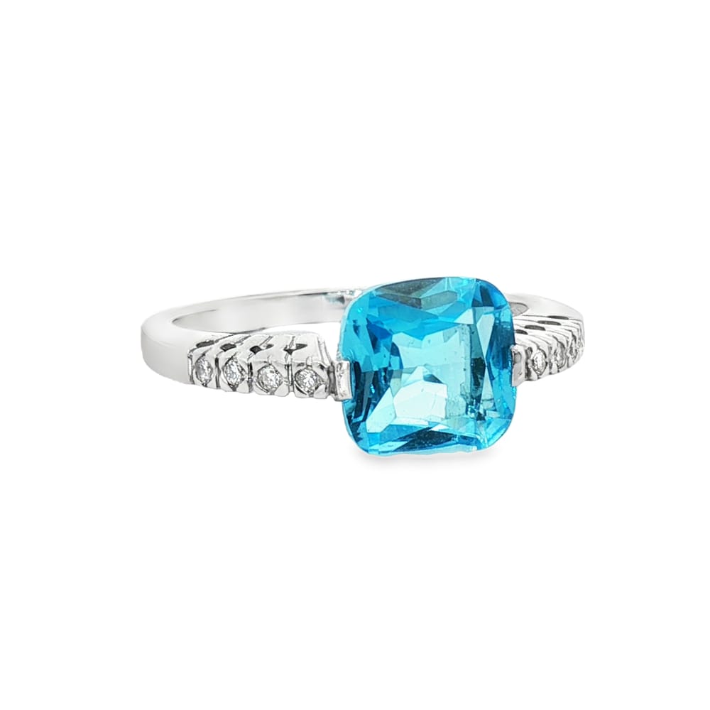 This exquisite ring features a vibrant cushion-cut blue topaz at its center, beautifully complemented by sparkling round diamonds. Crafted in luxurious 14K white gold, it showcases a perfect blend of elegance and modern style. Ideal for any occasion, this piece is designed for the discerning woman who appreciates fine jewelry.