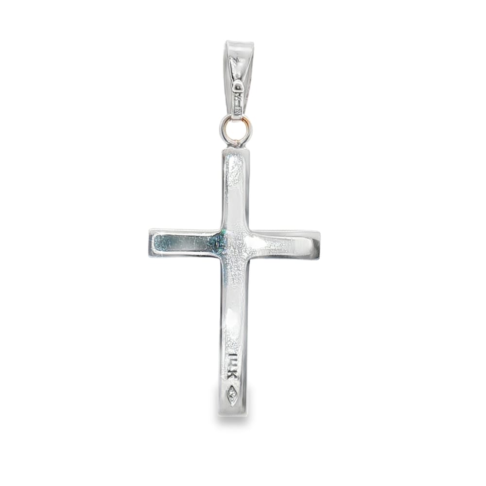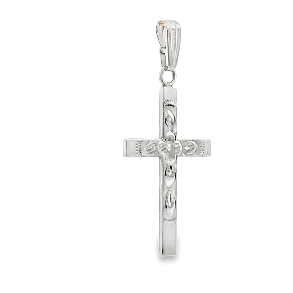 This exquisite 14K white gold pendant features a beautifully engraved flower and cross design, perfect for those who appreciate elegance and spirituality. Its compact size of 1 inch makes it a versatile accessory for any occasion. Elevate your jewelry collection with this timeless piece that combines devotion and artistry seamlessly.