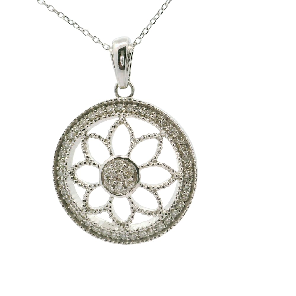 Elevate your elegance with this exquisite .43ct diamond pendant, artfully crafted into a beautiful flower design. Perfect for any occasion, this necklace adds a touch of sophistication and sparkle to your ensemble.