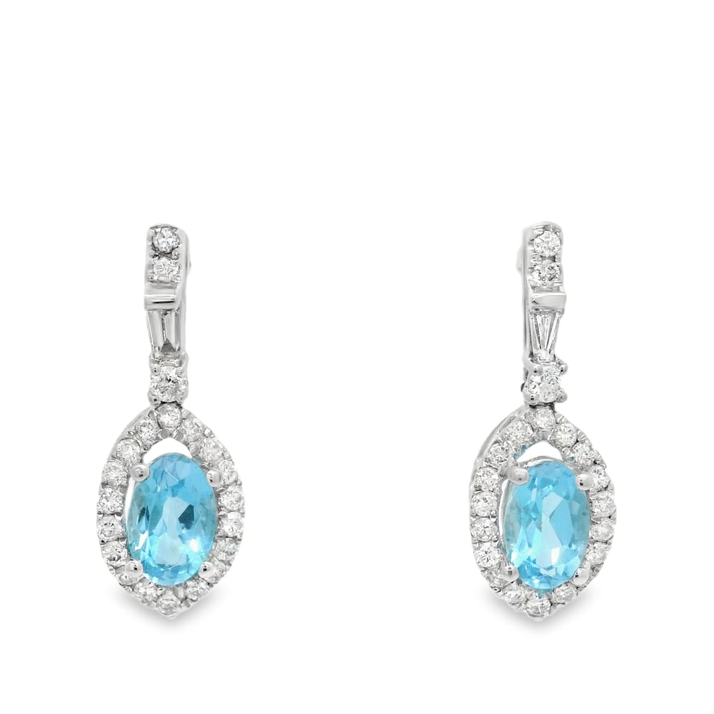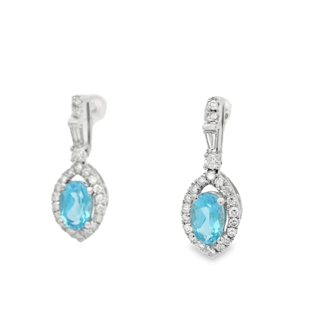 These exquisite earrings feature a vibrant 1.01ct oval blue topaz, elegantly set in luxurious 14K white gold. Enhanced with sparkling diamonds totaling 0.32ct and additional gems of 0.11ct, they make an ideal accessory for any occasion.