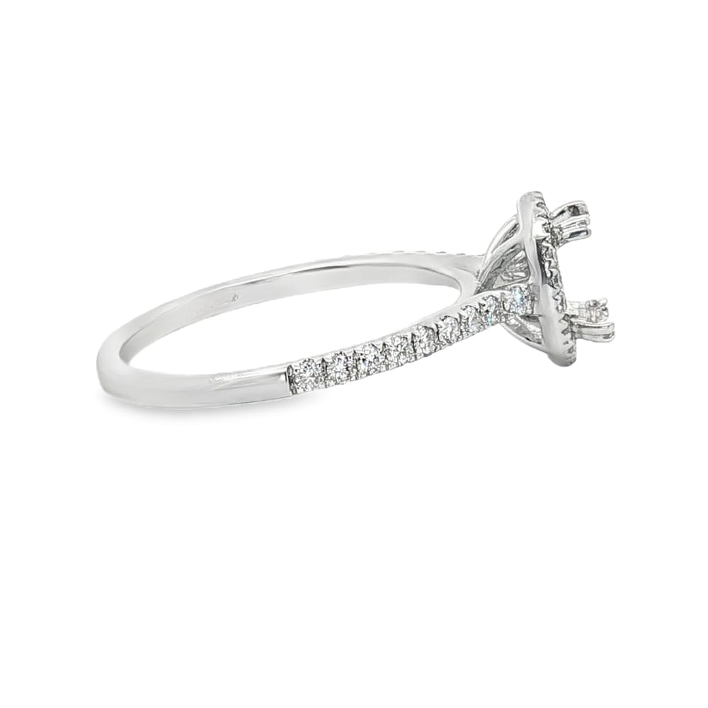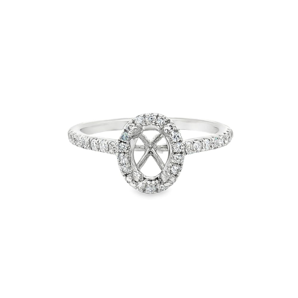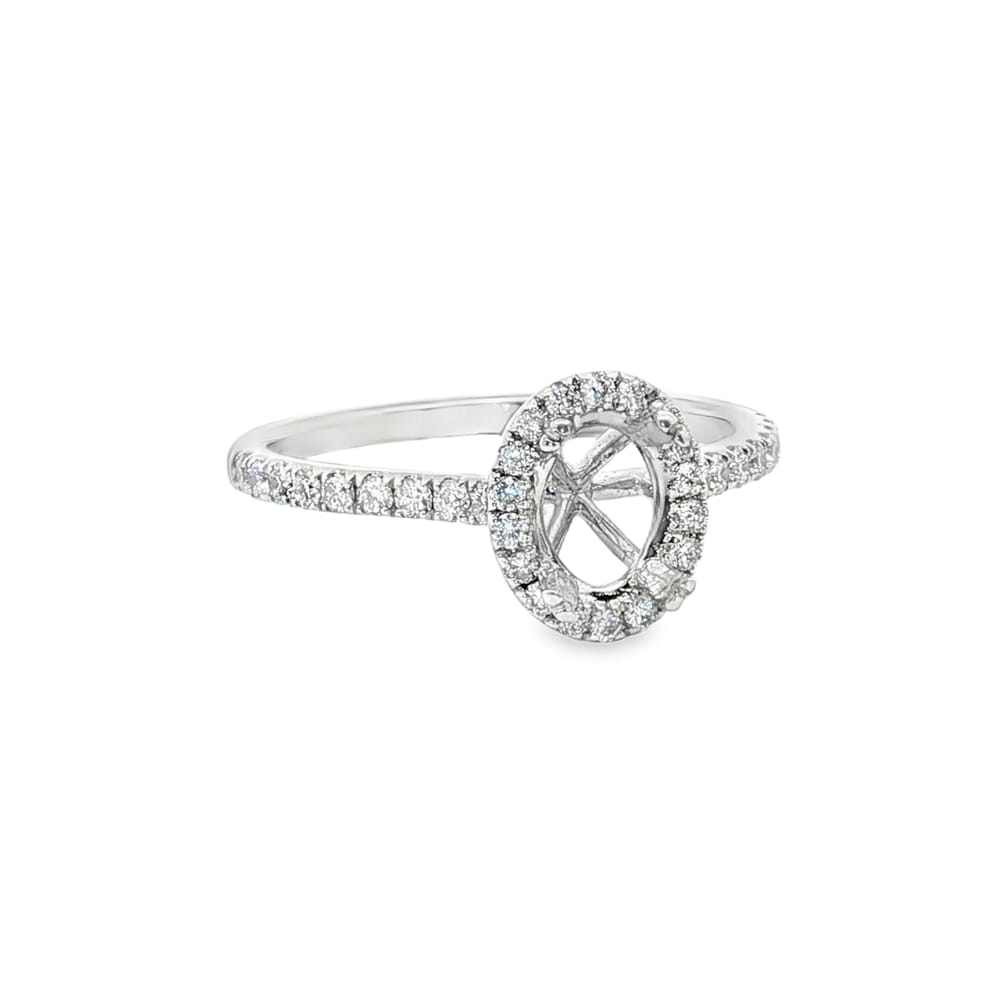 Elevate your romance with this exquisite oval semi-mount engagement ring crafted in lustrous 14K white gold. Featuring an impressive total of 36 sparkling round diamonds, this piece embodies elegance and timeless appeal. Perfect for the modern woman, it serves as a beautiful canvas for your chosen center stone, celebrating love and commitment in a truly magnificent way.