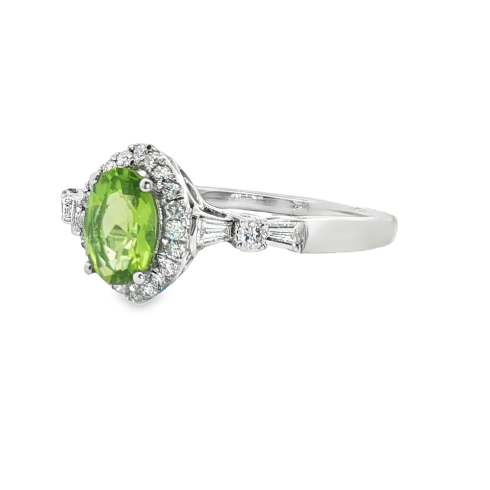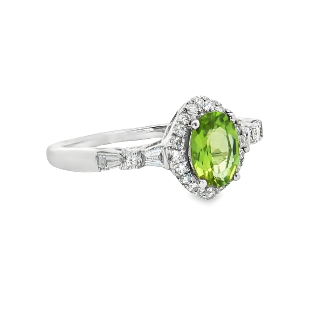 Elevate your jewelry collection with this exquisite 14K White Gold ring featuring a mesmerizing oval Peridot at its center, weighing 2.96 carats. Surrounding the vibrant green stone are 26 brilliant diamonds in baguette and round cuts, adding a dazzling contrast and shine. Perfect for women who appreciate both elegance and style, this ring is a stunning statement piece for any occasion.