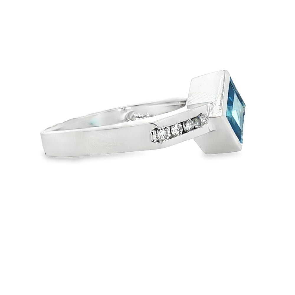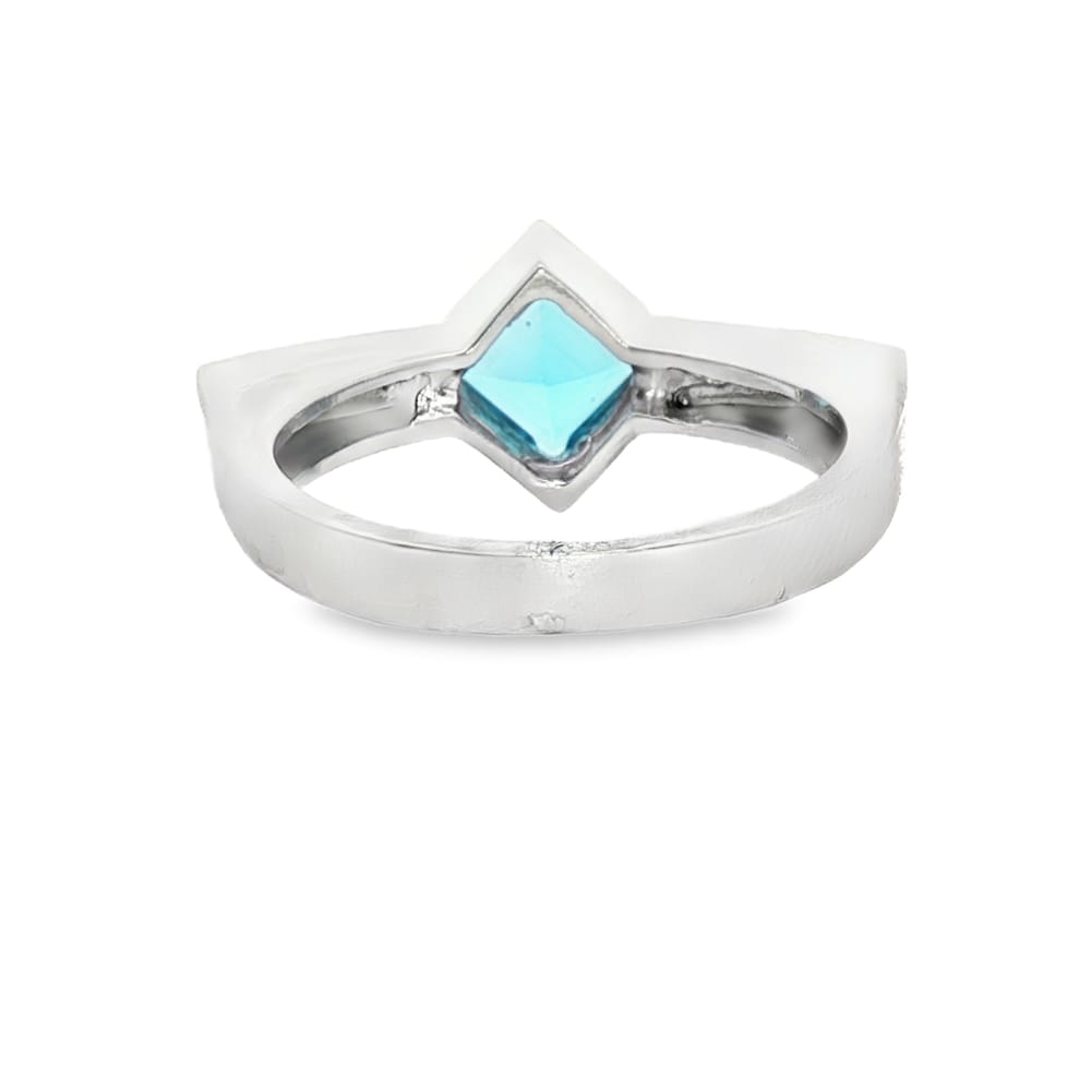 This exquisite ring features a striking blue topaz at its center, artfully cut in a princess shape, accented by brilliant round diamonds. Crafted in luxurious 14K white gold, it embodies elegance and sophistication, perfect for any occasion.