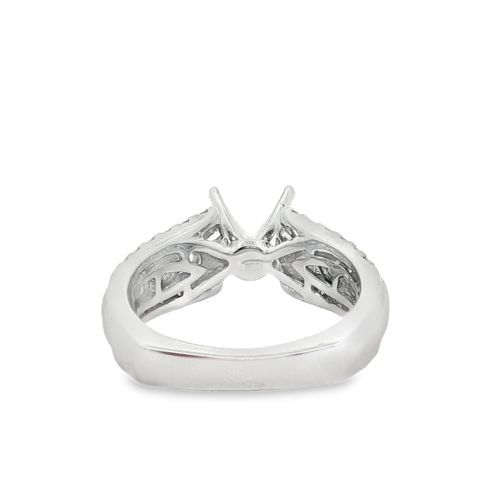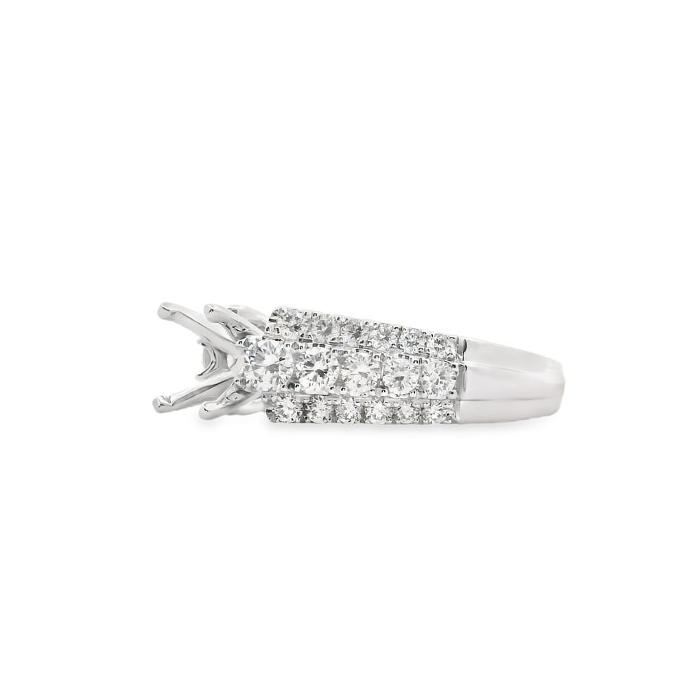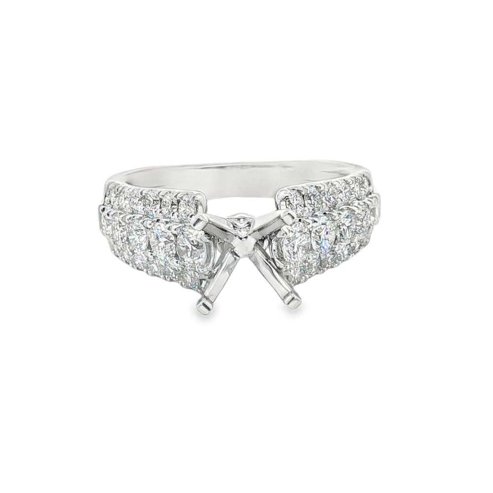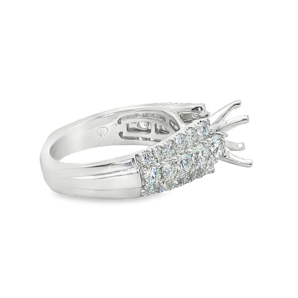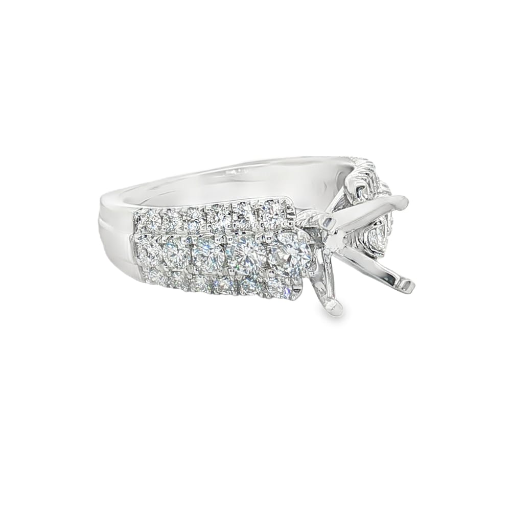 This exquisite semi-mount engagement ring crafted in 14K white gold showcases a breathtaking array of round diamonds totaling 1.23 carats. With 34 perfectly set stones, this piece is designed to highlight your choice of center stone with elegance and sophistication. A perfect blend of quality craftsmanship and timeless beauty, this ring is an ideal choice for any special occasion.