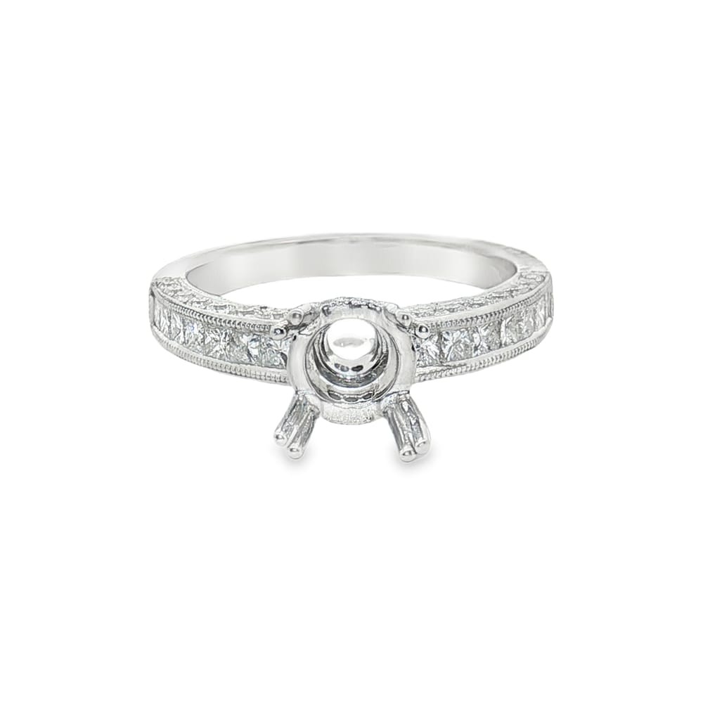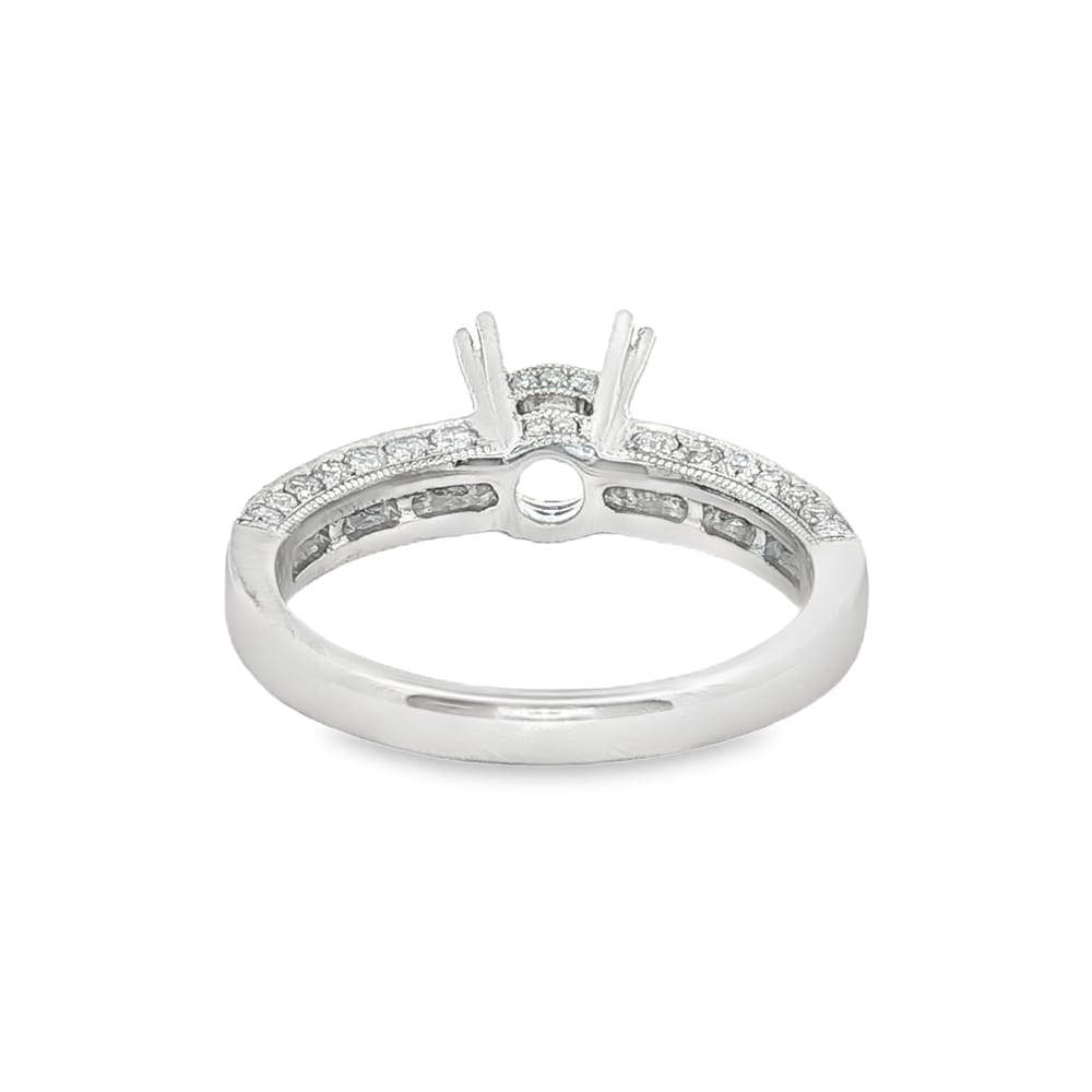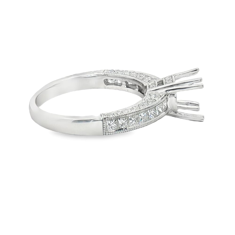 This exquisite engagement ring features a high-quality 14K white gold setting, elegantly designed to showcase its stunning array of 52 round natural diamonds. With a total weight of 0.82 ctw, the diamonds sparkle brilliantly, creating a captivating display that signifies love and commitment. Perfect for the discerning individual seeking a semi-mount design, this ring is a beautiful blank canvas for personalizing with your chosen center stone.