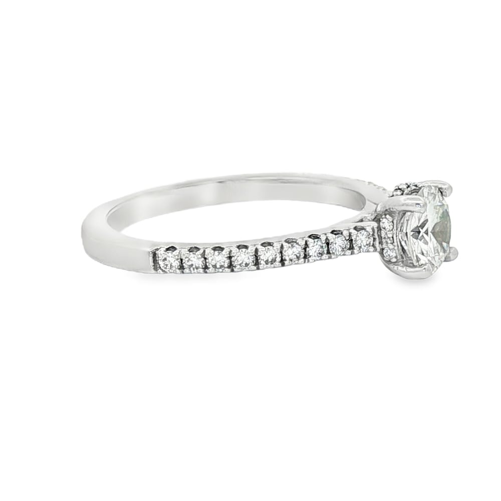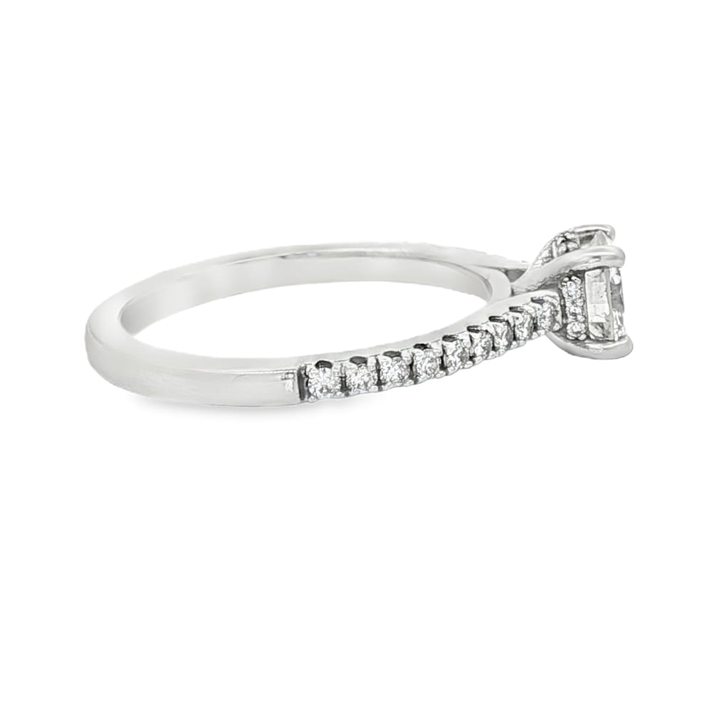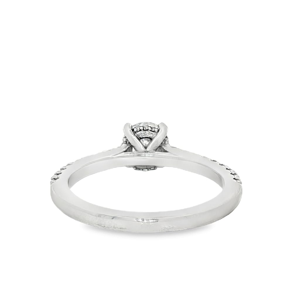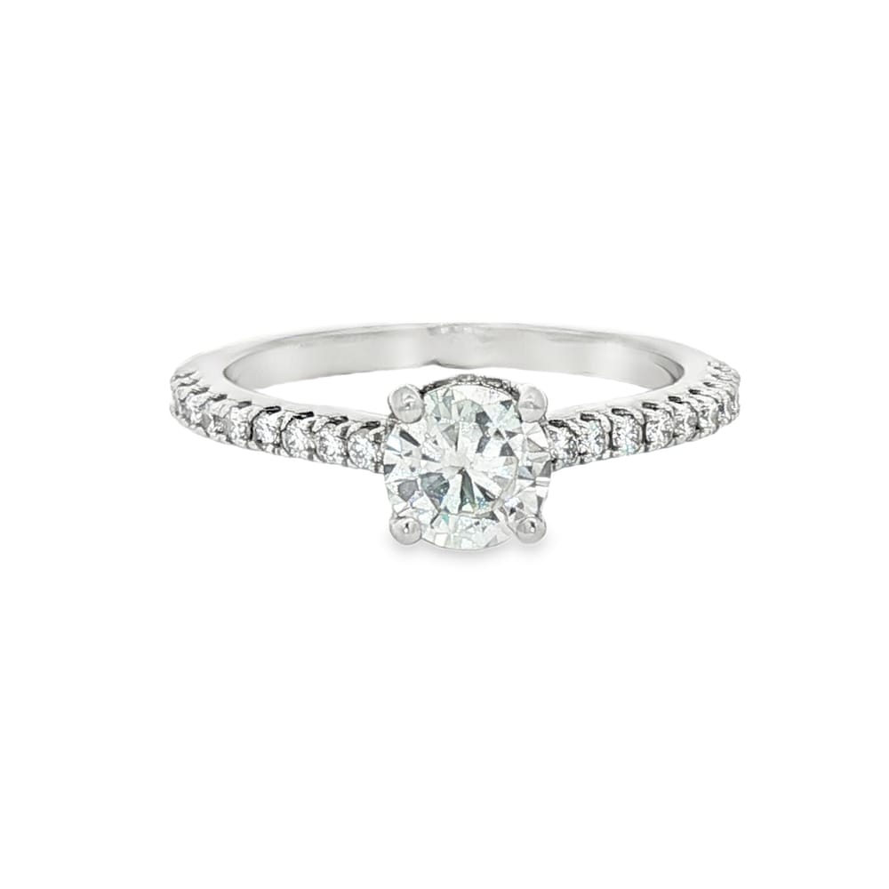 This exquisite semi-mount engagement ring showcases a beautifully crafted 14K white gold band, weighing 3.11 grams. Designed to hold a captivating centerpiece, it is adorned with 30 sparkling round diamonds totaling 0.24 carats, enhancing its luxurious appeal. Perfect for the bride-to-be, this ring offers an elegant foundation for your love story.