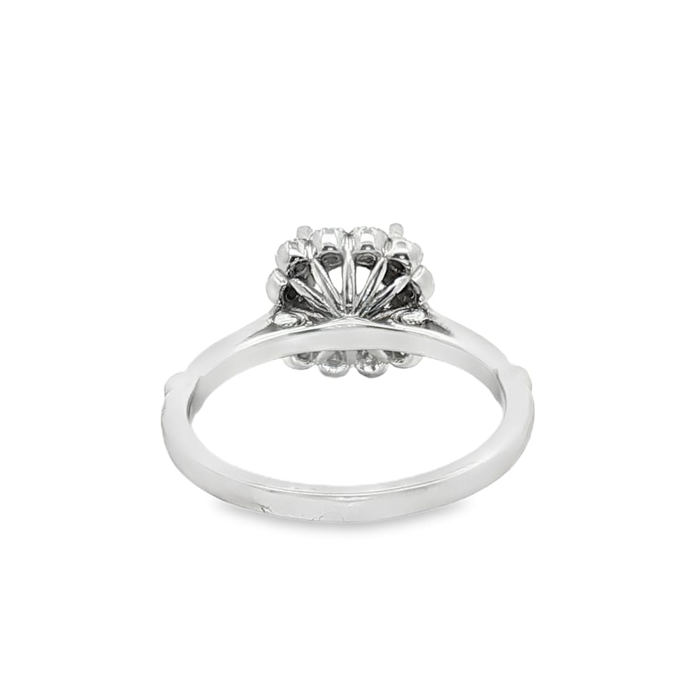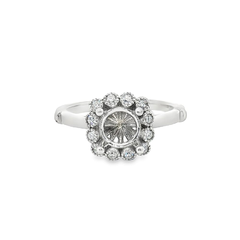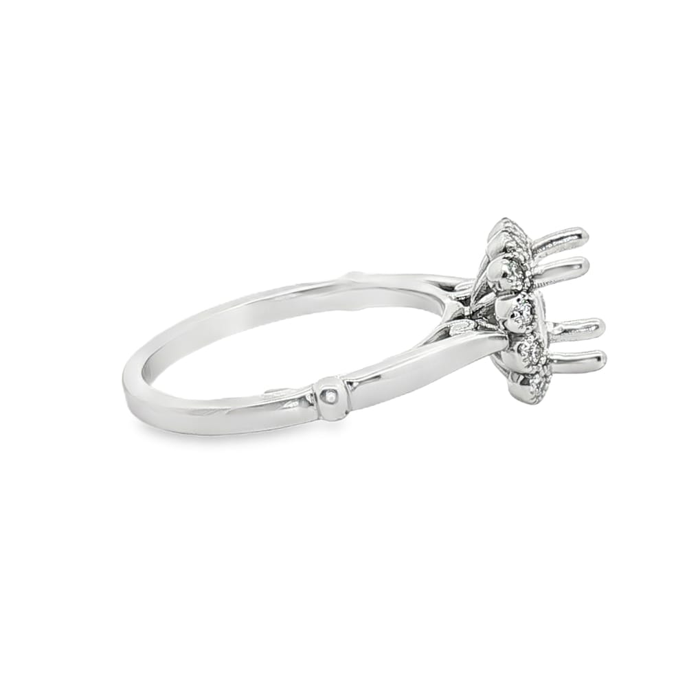 This exquisite semi-mount engagement ring features a graceful flower design, crafted from premium 14K white gold. Accented with twelve radiant round diamonds, it beautifully enhances the brilliance of your chosen center stone. Perfectly tailored for the modern woman, this ring is a flawless symbol of love and commitment.