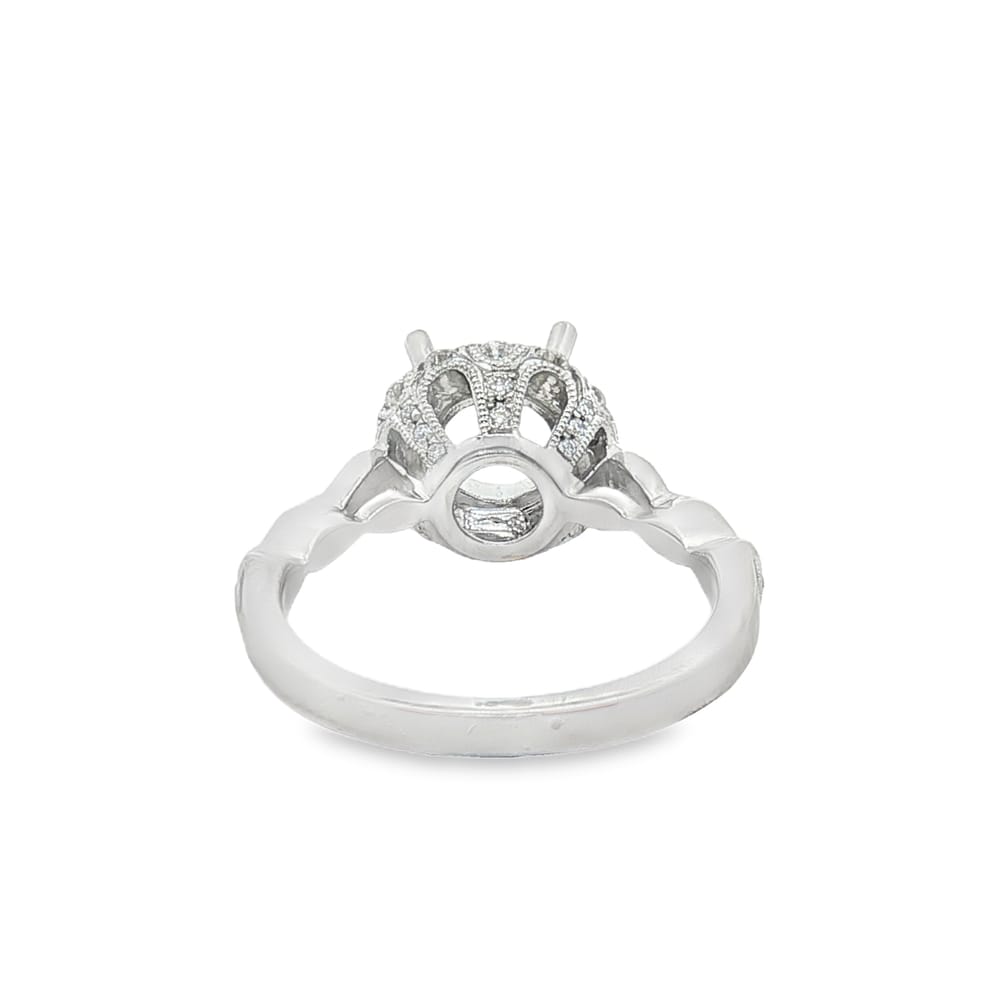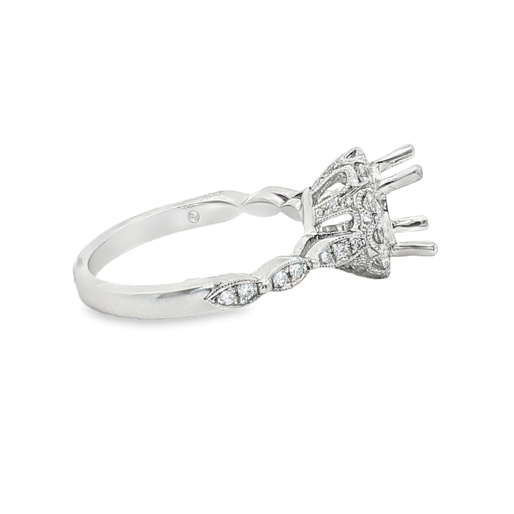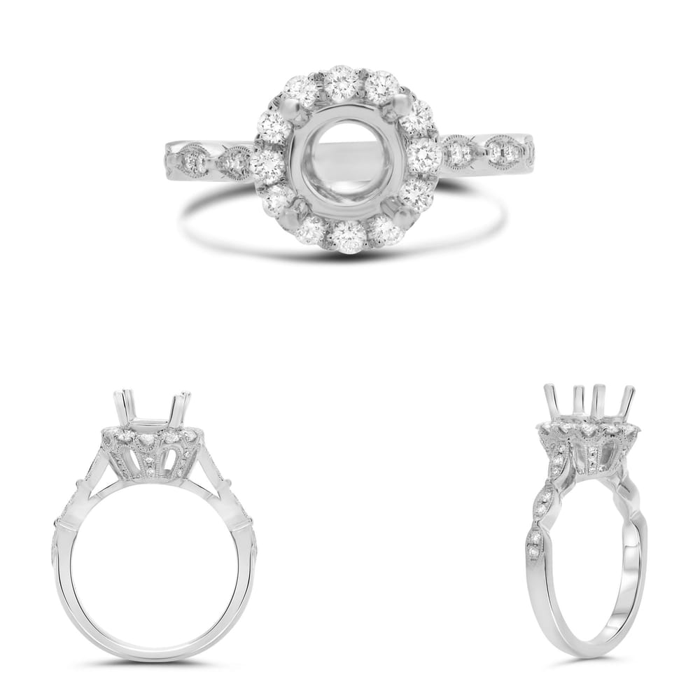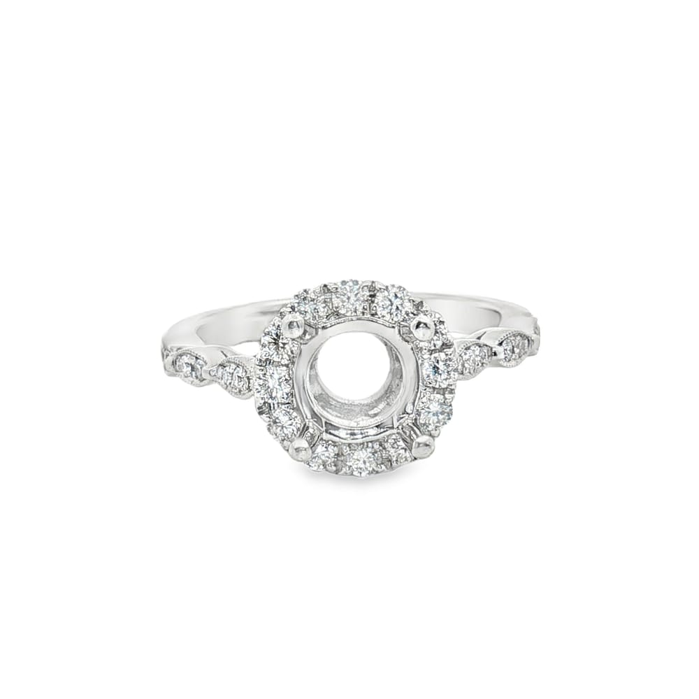 This enchanting semi-mount halo engagement ring is crafted from 14K white gold and adorned with 42 radiant natural diamonds. Perfectly designed for women, this ring serves as a stunning embrace for your chosen center stone, showcasing elegance and sophistication. Its intricate diamond setting enhances the overall brilliance, making it an exquisite choice for a memorable proposal.