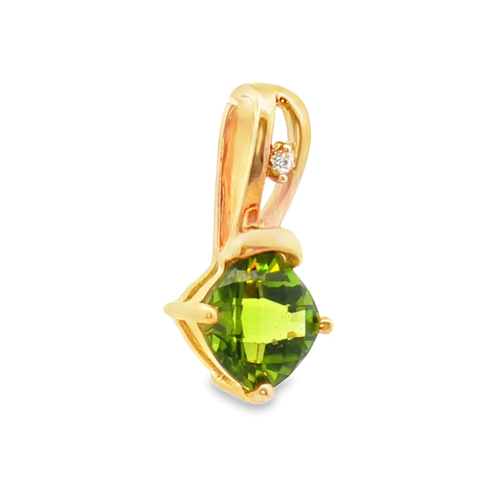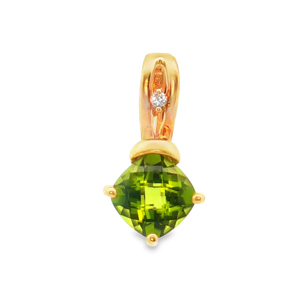This exquisite pendant features an 8mm cushion-cut peridot adorned with glimmering diamonds totaling .02TW. Crafted in 14K yellow gold, it is a perfect blend of elegance and sophistication for any jewelry collection.