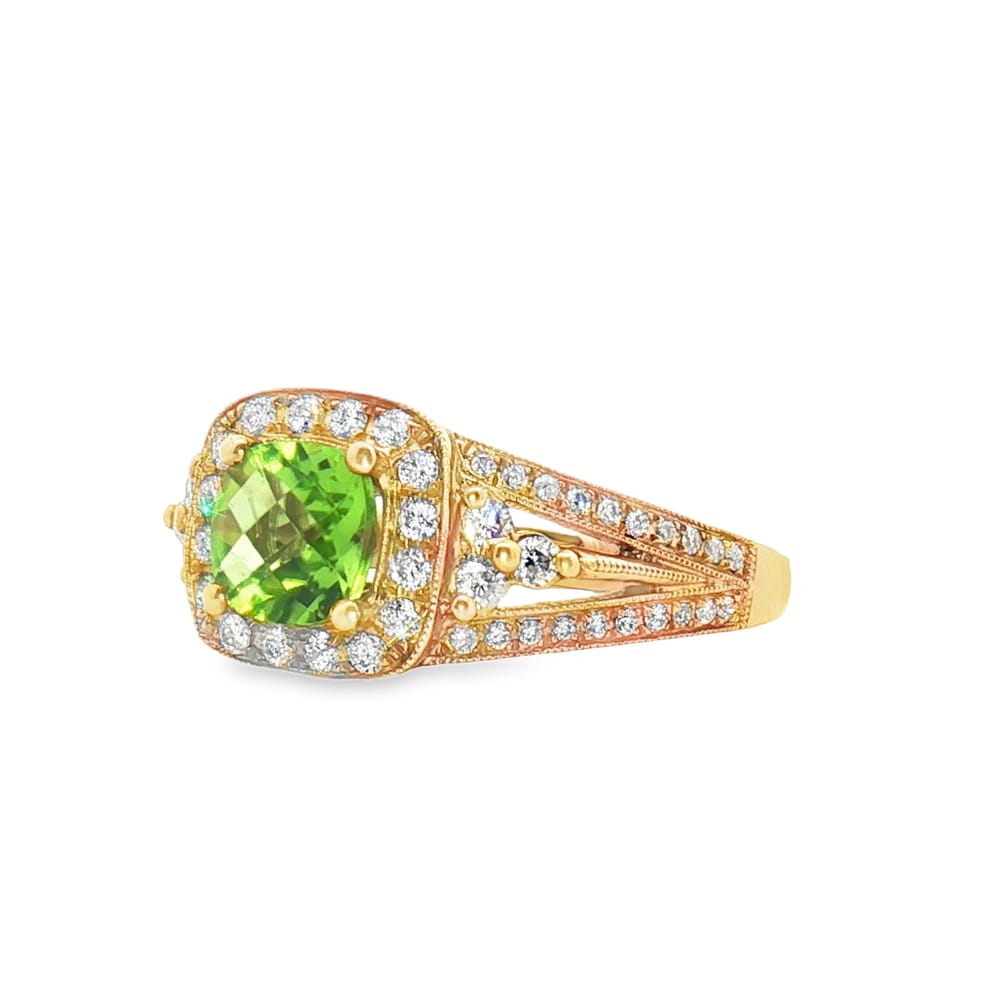 This exquisite ring features a captivating cushion-shaped peridot, elegantly complemented by a dazzling array of diamonds. Crafted in 14K yellow gold, this piece is a beautiful addition to any jewelry collection.