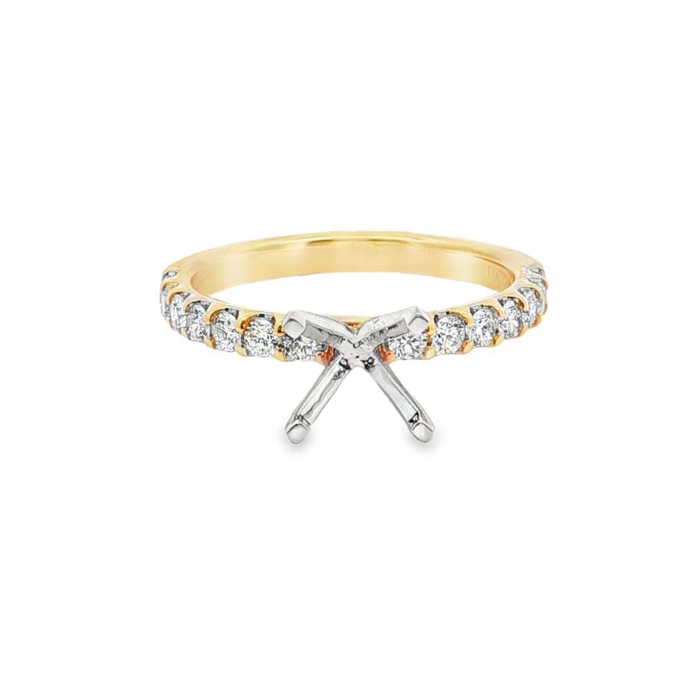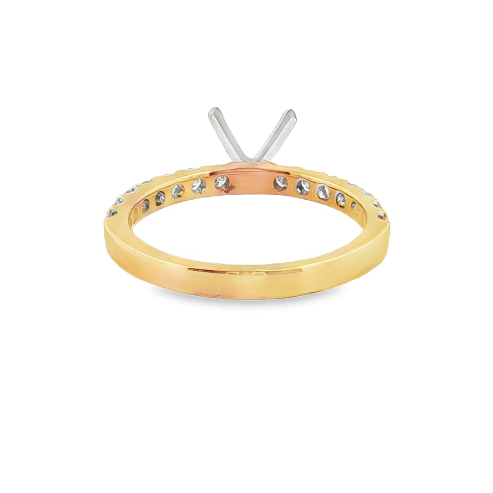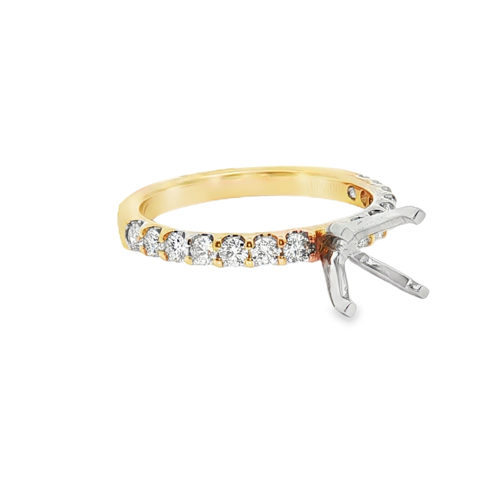 This exquisite engagement ring setting is crafted from luxurious 14K yellow and white gold, combining elegance with durability. It features a captivating arrangement of 14 round diamonds totaling 0.50 carats, providing a brilliant backdrop for your chosen center stone. Perfect for the discerning bride, this ring setting ensures both beauty and lasting quality for a lifetime of cherished memories.