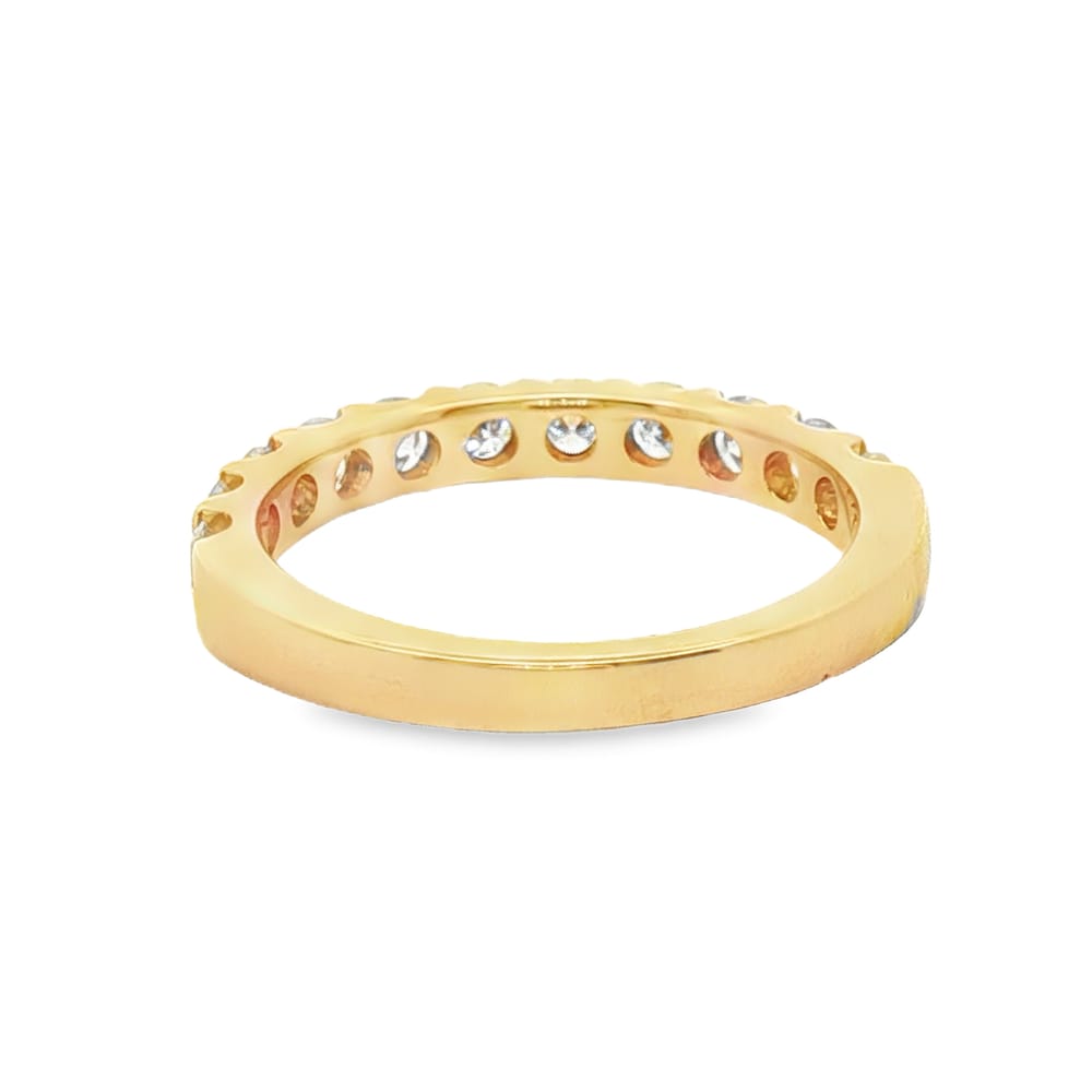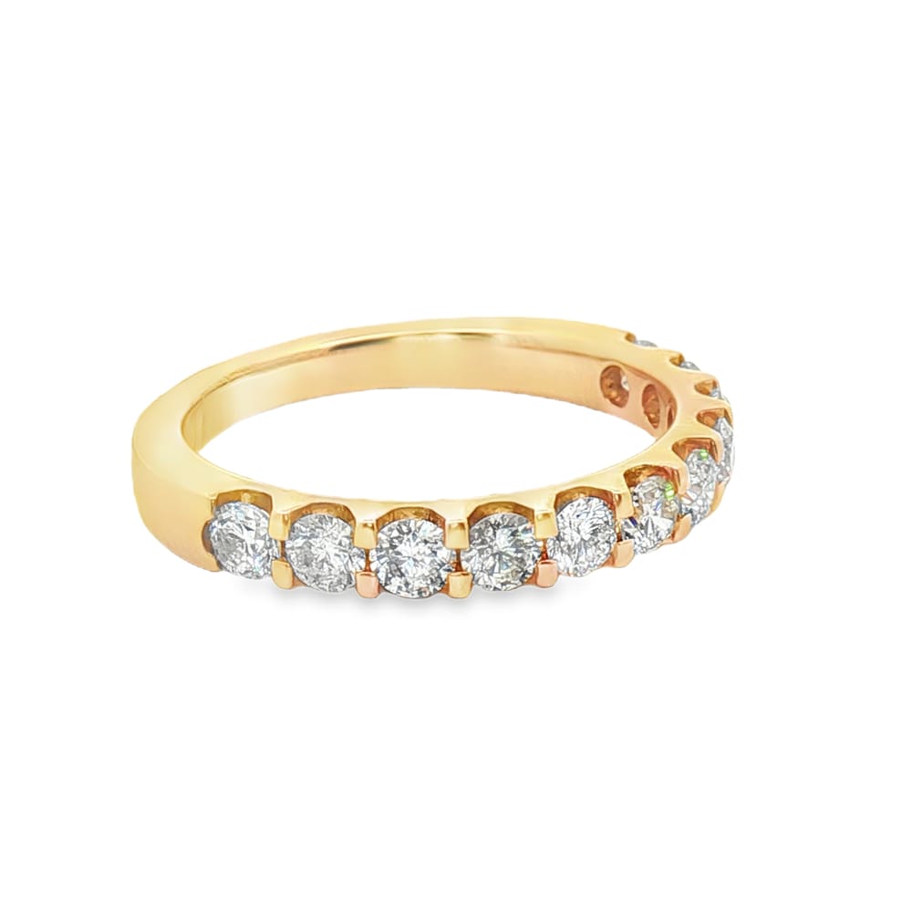 Celebrate your love with this exquisite 14K yellow gold wedding band designed for women. Adorned with 11 round diamonds totaling 1.00 ctw, this elegant piece radiates timeless beauty and sophistication. Its perfect fit and luxurious metal make it an ideal symbol of your everlasting bond.