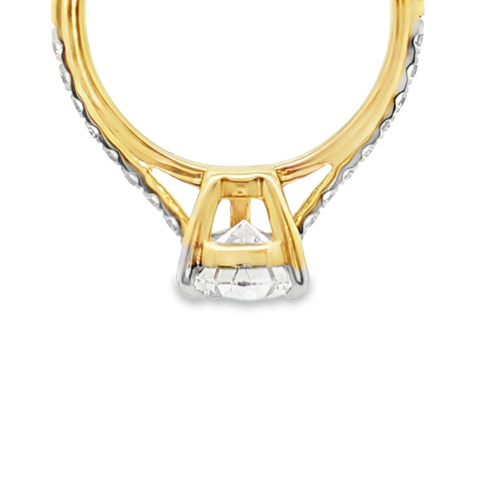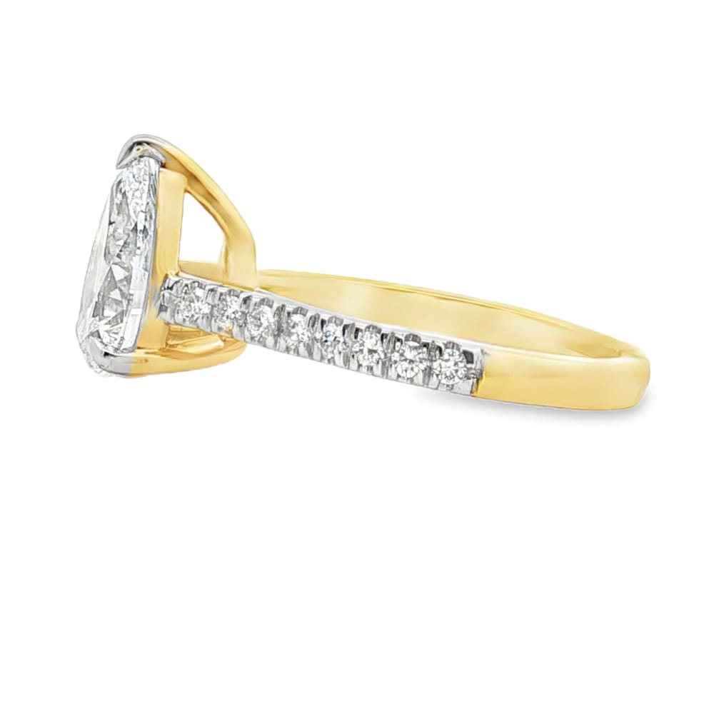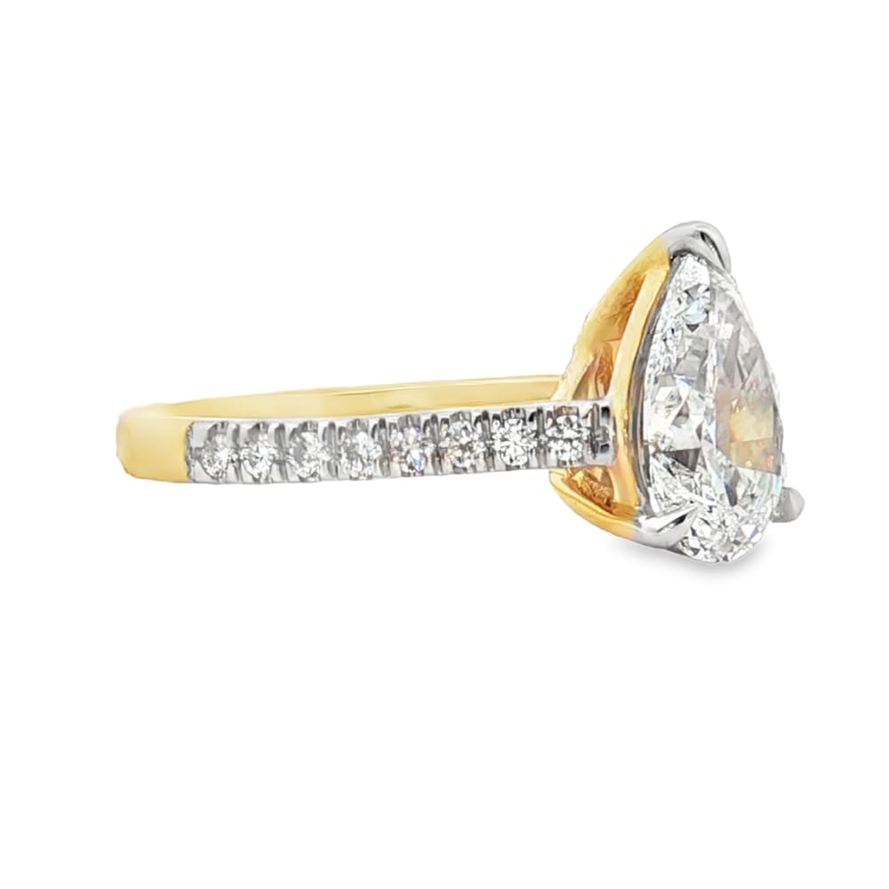 This exquisite engagement ring features a captivating 2.00 ct pear-shaped lab-grown diamond with an F color and VS1 clarity, making it a perfect symbol of your love. Surrounding the center stone are 16 dazzling lab-grown diamonds, adding 0.24 ct with an E-F color grade, enhancing the ring’s elegance and sophistication. IGI Certified.