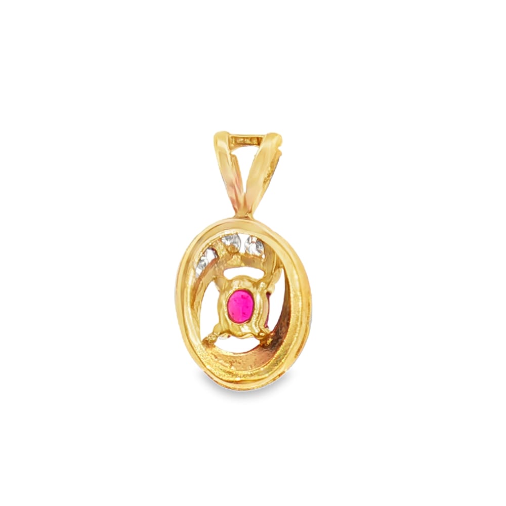 Elevate your collection with this exquisite 14K yellow gold pendant featuring a vibrant oval ruby at its center, elegantly highlighted by four sparkling diamonds. Perfect for any occasion, this piece combines classic charm with a modern twist.