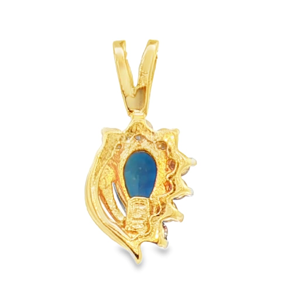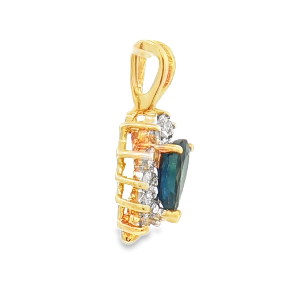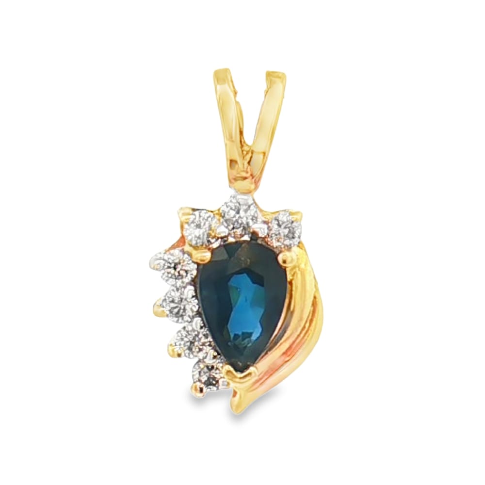 This exquisite pendant features 14K yellow gold with sparkling diamonds and a pear-shaped sapphire, making it a mesmerizing addition to any jewelry collection. Perfect for elevating both casual and formal outfits, this piece is designed to enhance your elegance effortlessly.
