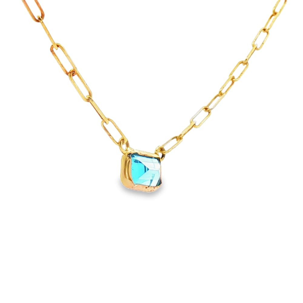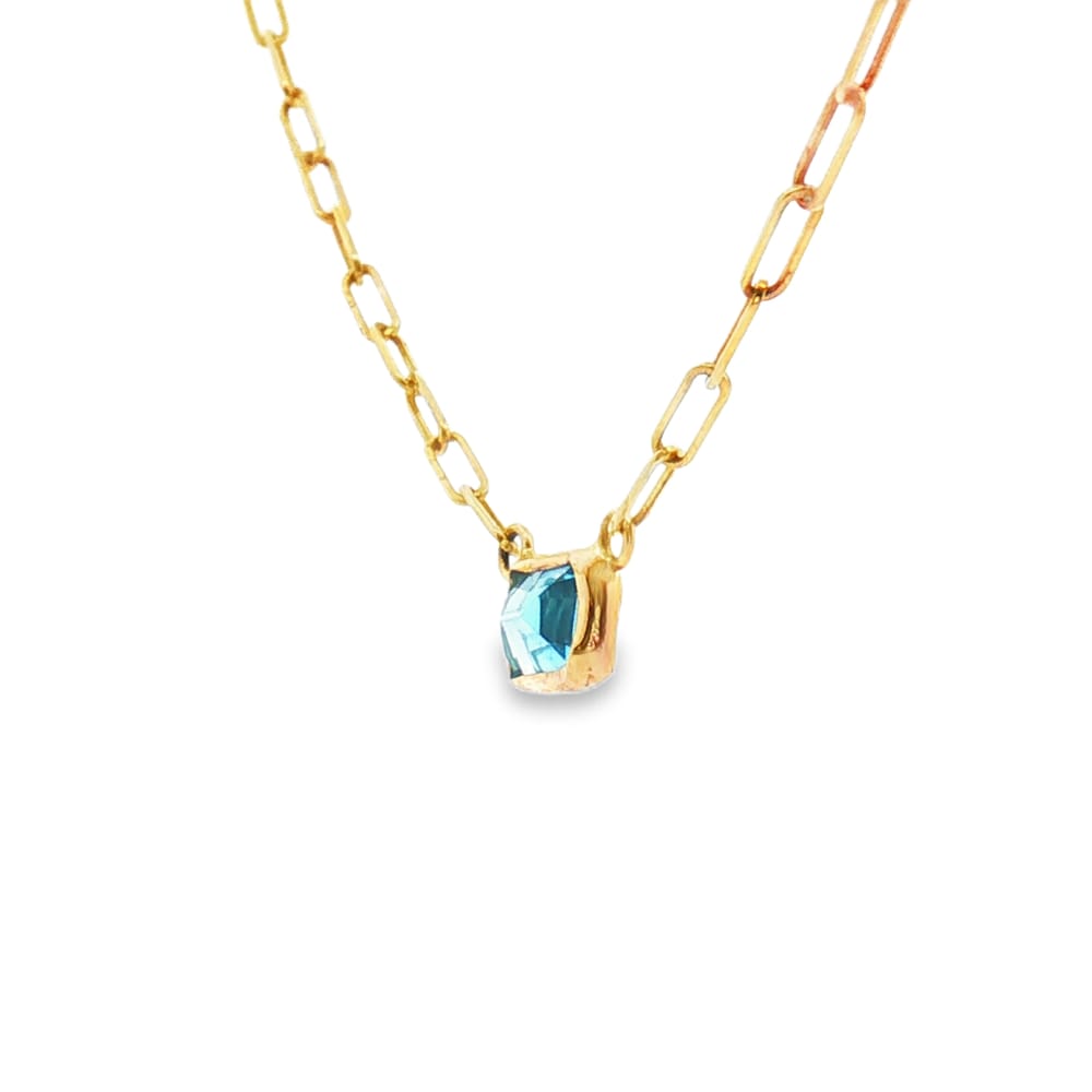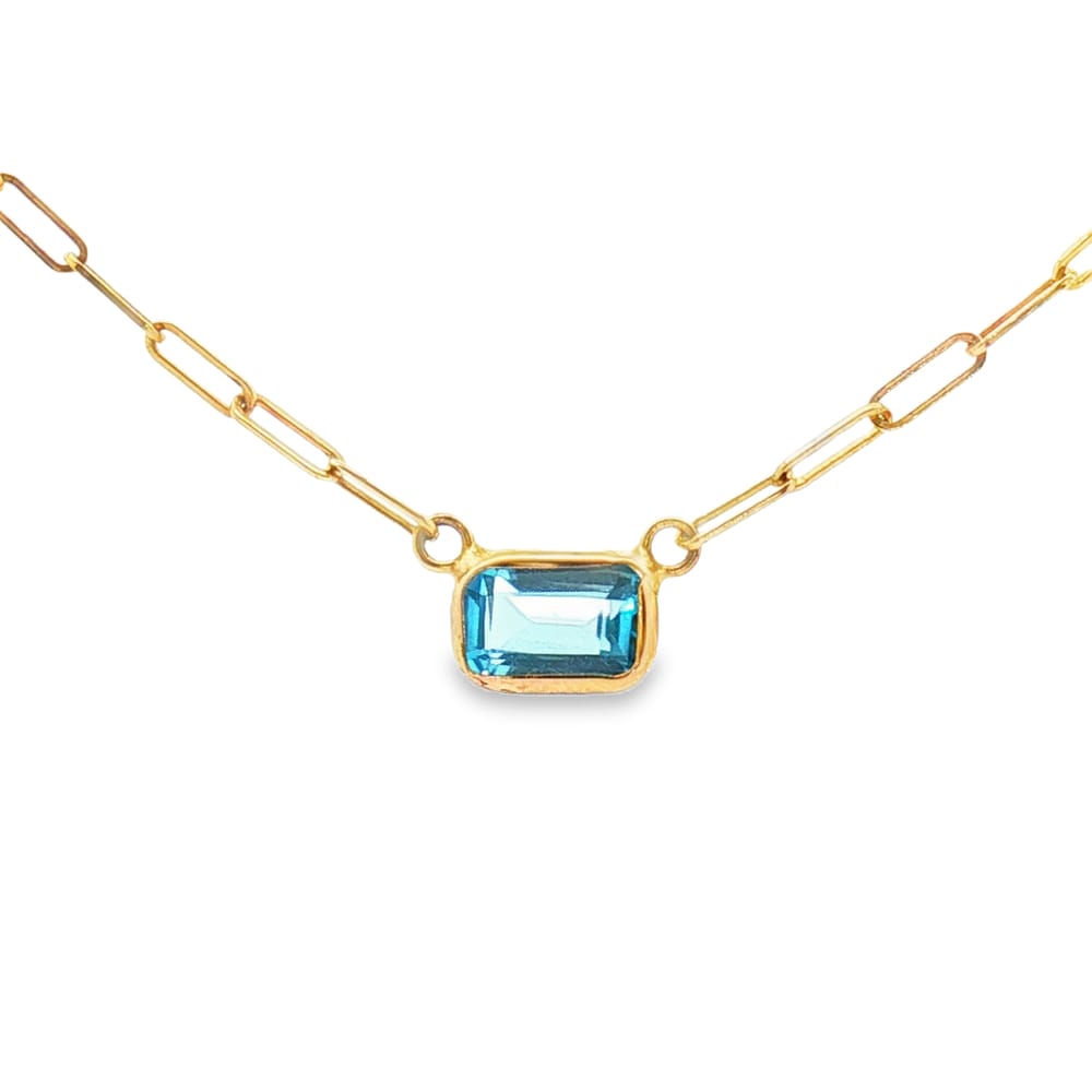 This elegant necklace features a delightful centerpiece of a Swiss Blue Topaz gemstone set in luxurious 14K yellow gold. Perfect for adding a splash of color to any outfit, it combines modern design with timeless elegance.