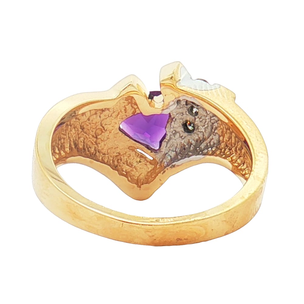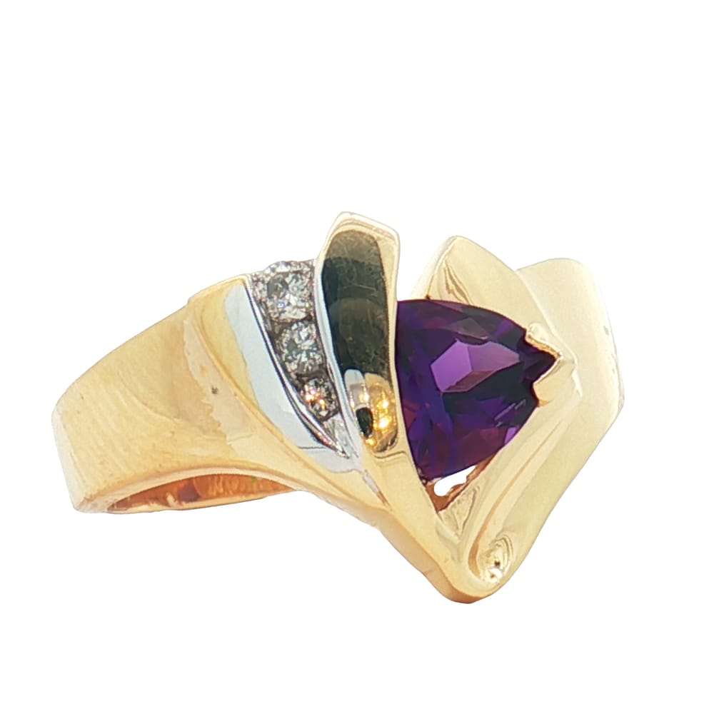 Elevate your jewelry collection with this exquisite 14K yellow gold ring featuring a trillion-cut amethyst and shimmering diamonds. The elegant design beautifully combines the vibrant hue of amethyst with the timeless sparkle of diamonds, making it a perfect accessory for any occasion.