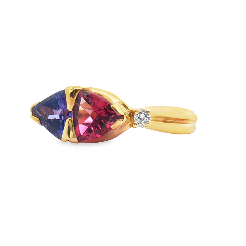 This exquisite ring features a 14K gold setting adorned with a vibrant trillion-cut tanzanite and pink tourmaline, complemented by sparkling diamonds. Perfect for adding a touch of elegance to any occasion, this piece combines quality craftsmanship with stunning color.