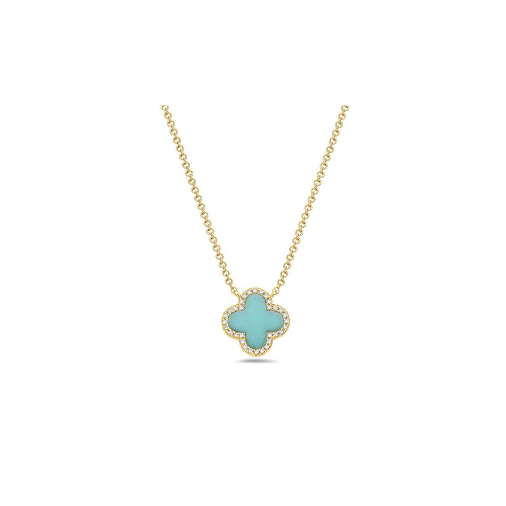 This exquisite necklace features a captivating turquoise center stone surrounded by 32 round diamonds totaling 0.08 carats. Crafted in luxurious 14K yellow gold, it elegantly combines bold color with shimmering brilliance, perfect for any occasion.