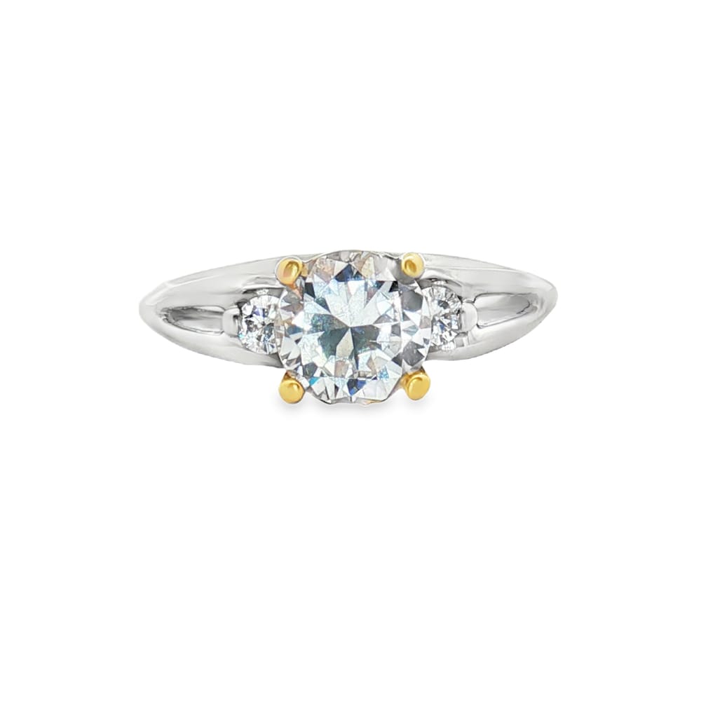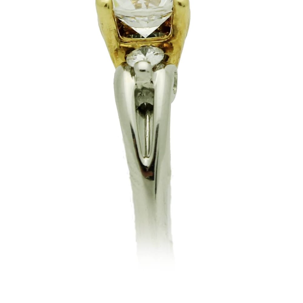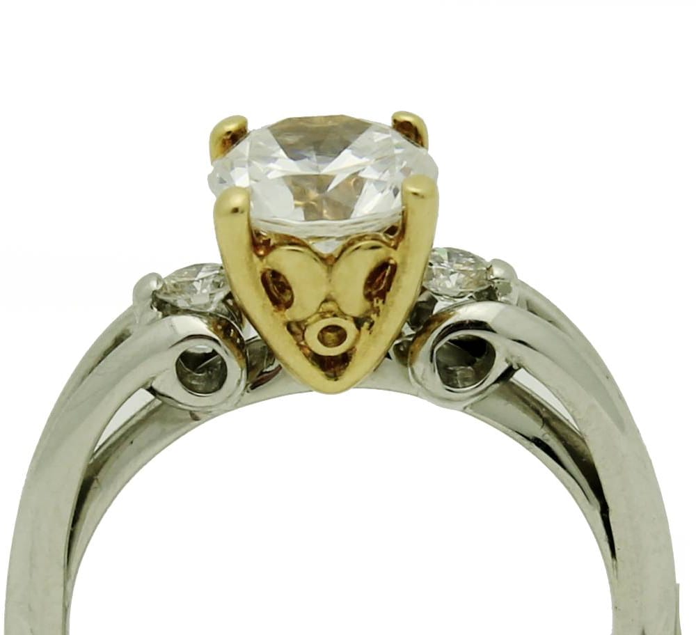 This exquisite engagement ring features a semi-mount design crafted from 18K gold and platinum, perfect for showcasing your chosen center stone. The ring is adorned with two side round cubic zirconia diamonds totaling 0.14 carats, adding a touch of elegance and brilliance. With a gross weight of 4.81 grams, this luxurious piece is designed to make your special moment unforgettable.