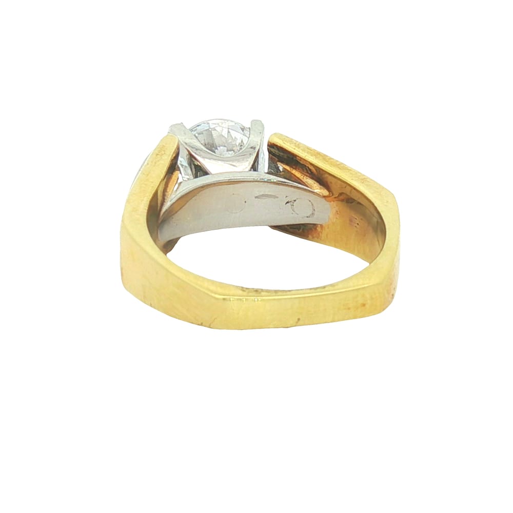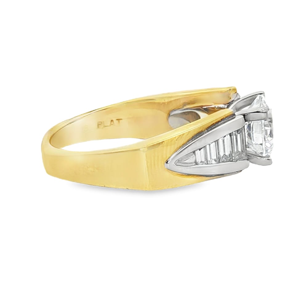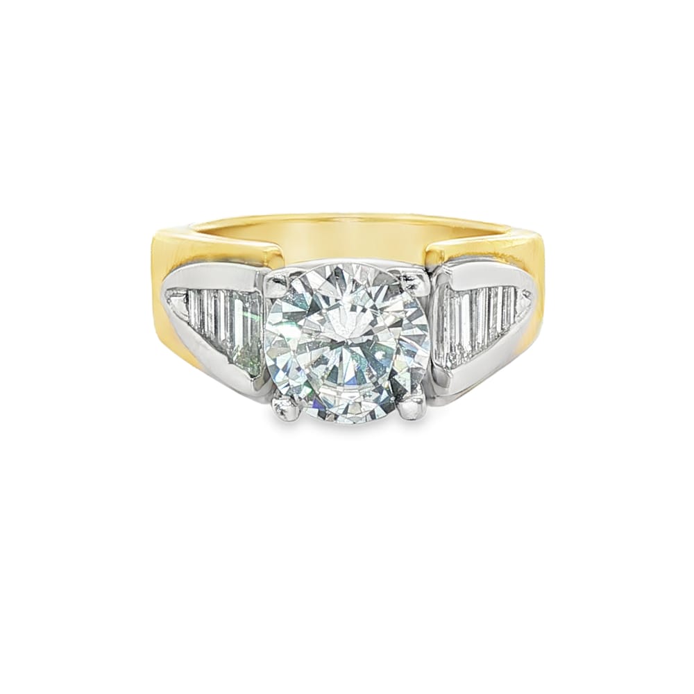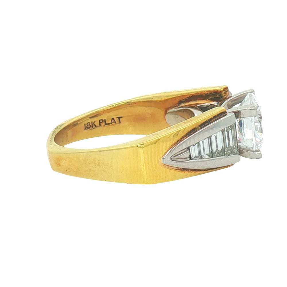 This exquisite semi-mount engagement ring features a cubic zirconium center alongside eight beautiful baguette diamonds, totaling 0.75 carats. Crafted in a luxurious combination of 18K gold and platinum, it offers both elegance and durability. Weighing 12.72 grams, this ring is designed for women who appreciate radiant beauty in timeless jewelry.