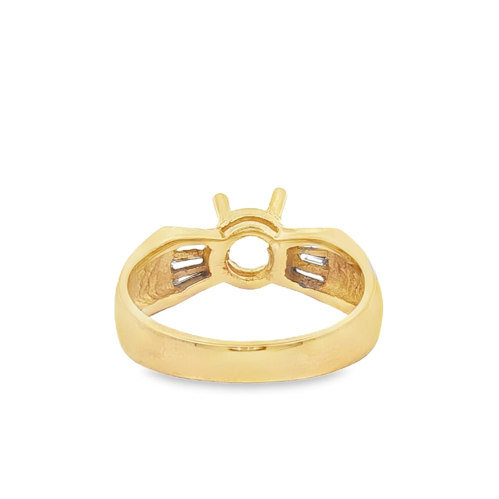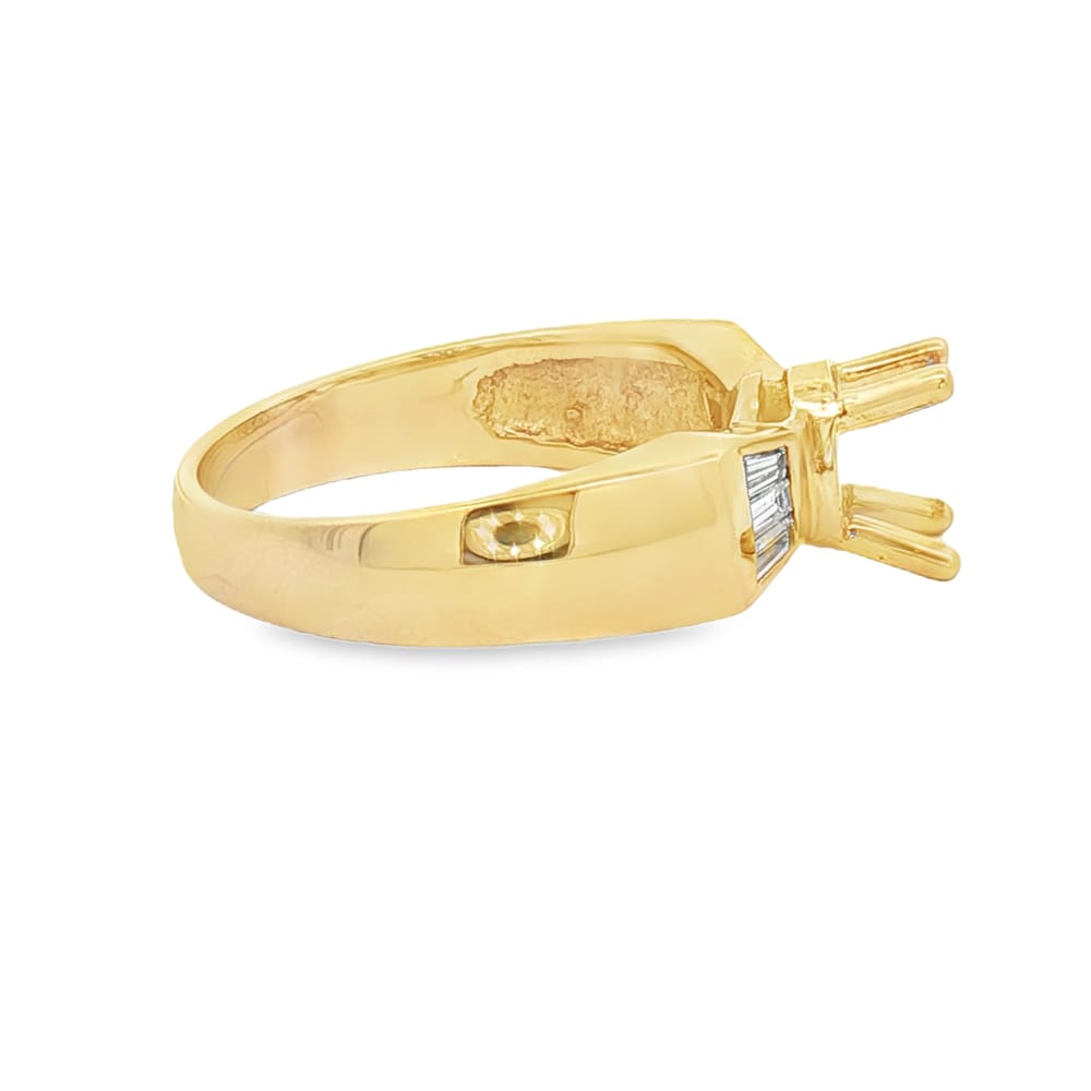 This exquisite semi-mount engagement ring features a captivating design crafted from luxurious 18K yellow gold. Accented by six brilliant baguette diamonds totaling 0.26 carats, it radiates elegance and sophistication. Perfect for showcasing your chosen center stone, this piece is an ideal choice for the modern bride.