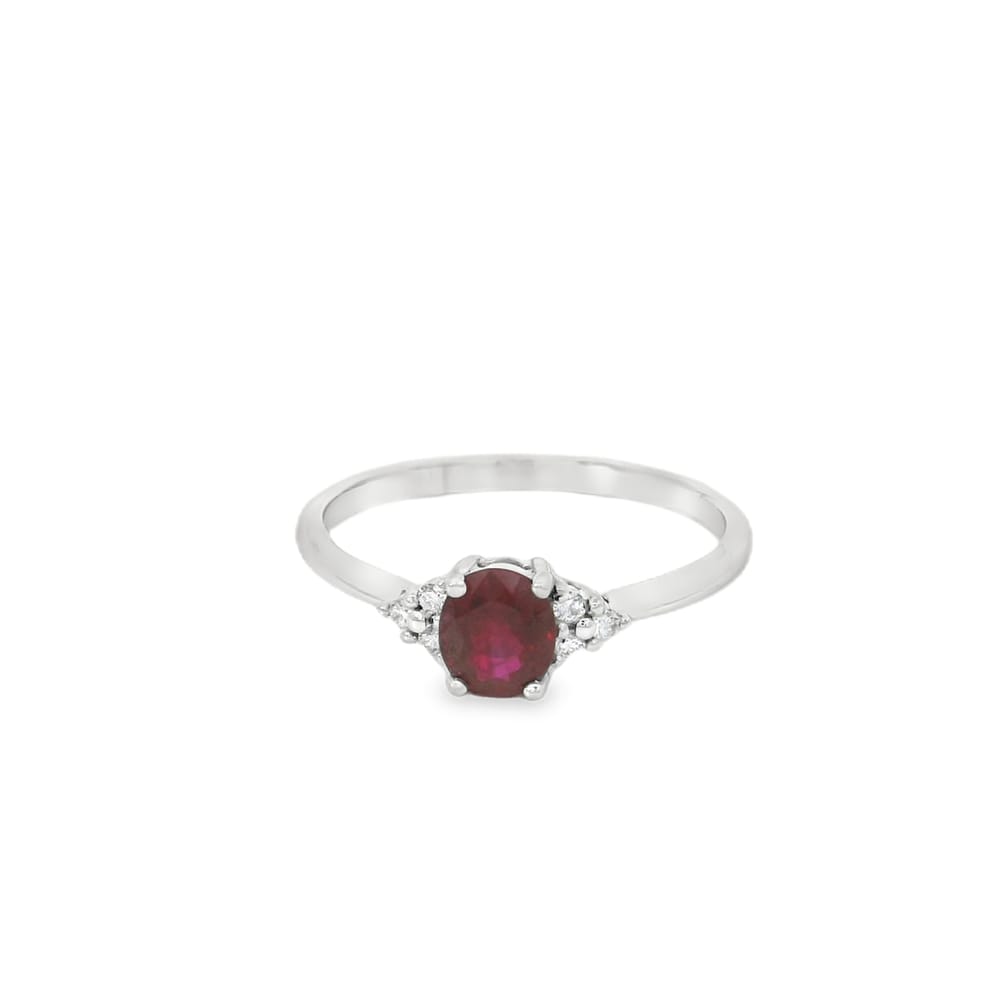 This exquisite ring features a vibrant oval ruby, weighing 0.54 carats, beautifully complemented by six dazzling diamonds totaling 0.07 carats. Crafted in luxurious 18K white gold, it makes a perfect statement piece, adding a touch of elegance to any outfit.