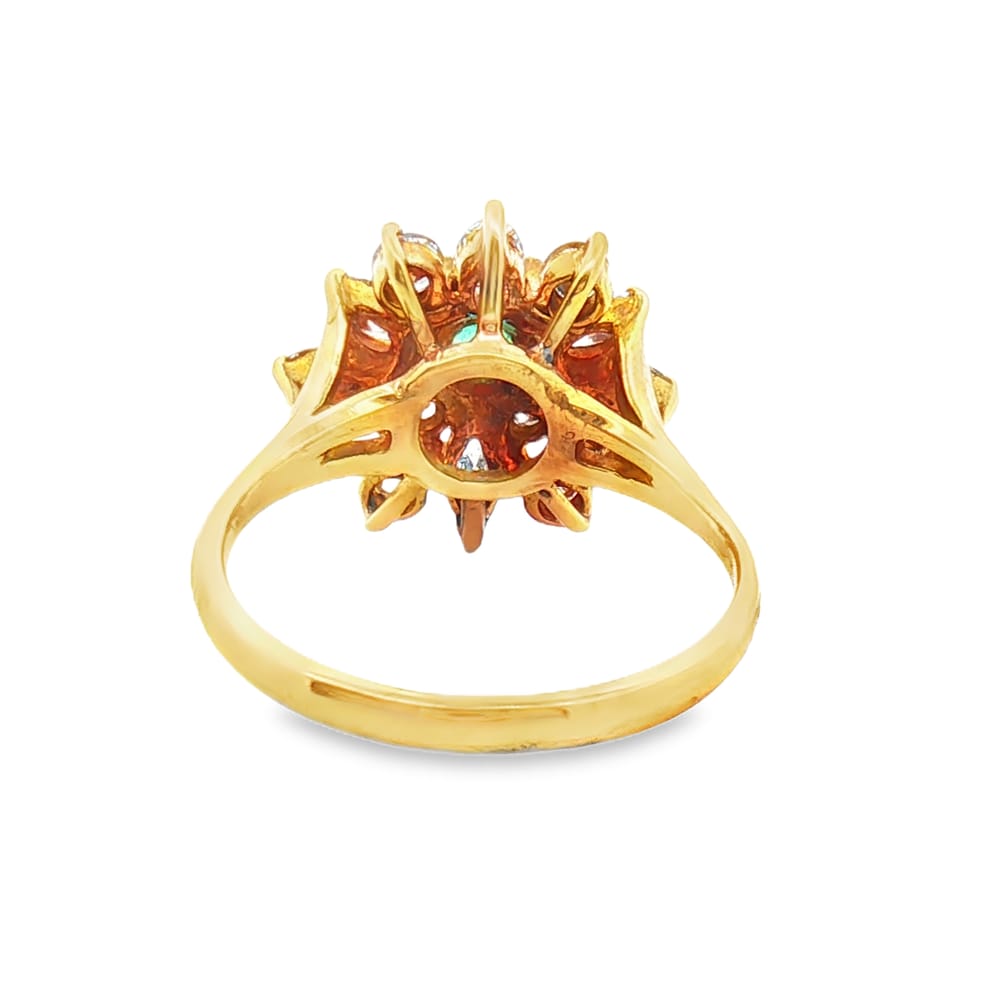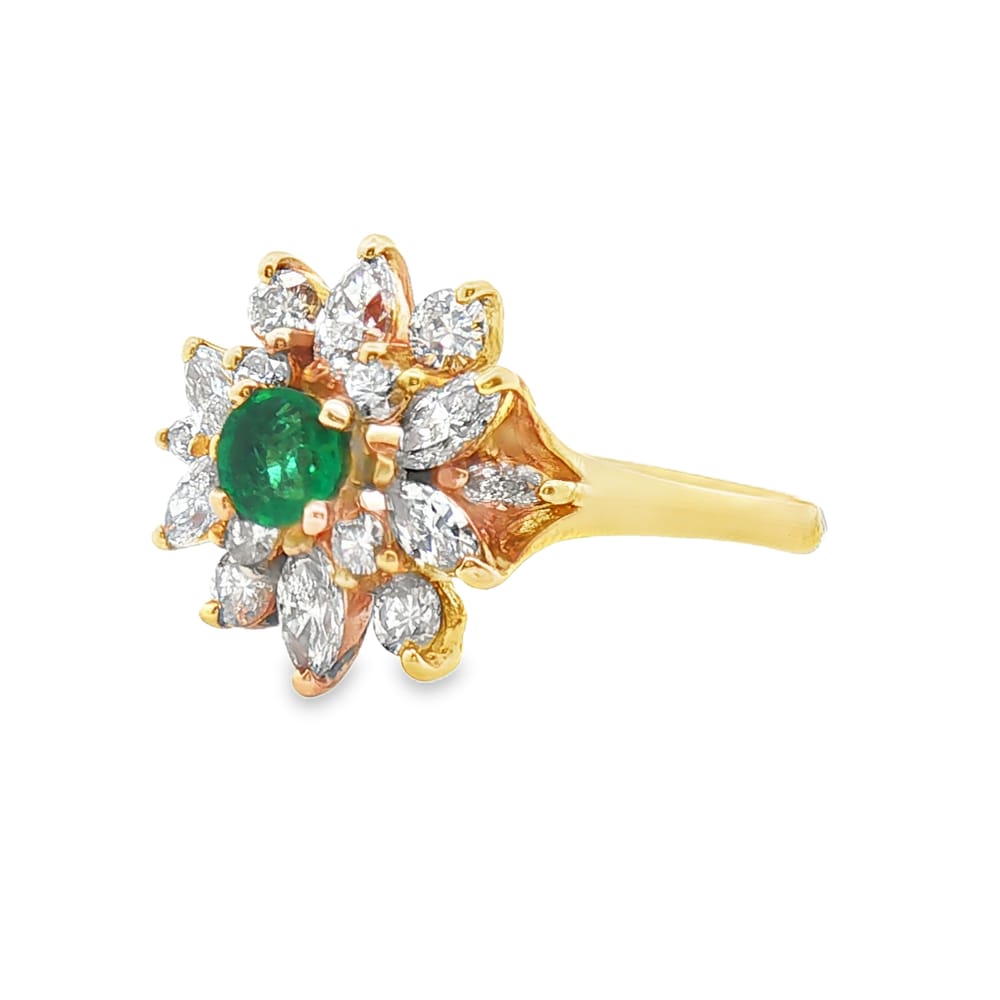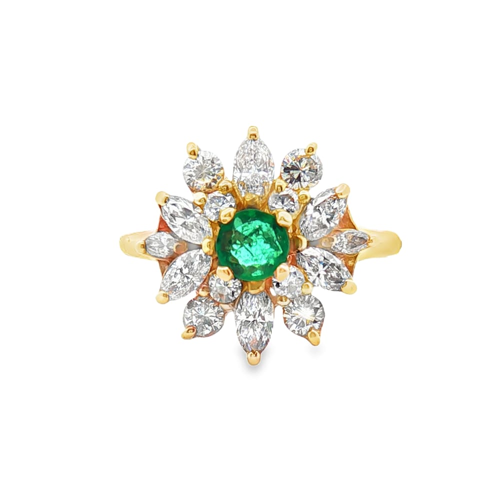 This exquisite ring features a vibrant round emerald set in luxurious 18K gold, designed specifically for women. Adorned with delicate diamond accents, it radiates elegance and charm, making it a perfect addition to any jewelry collection.