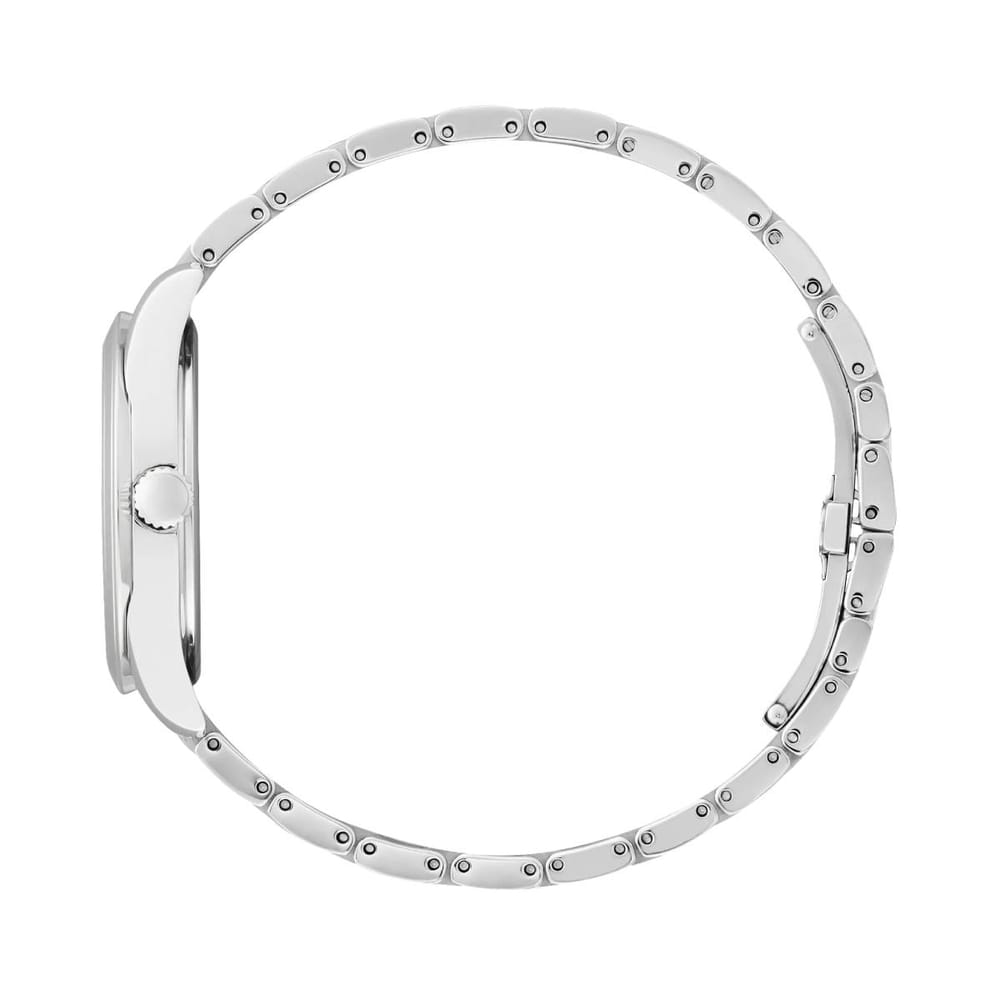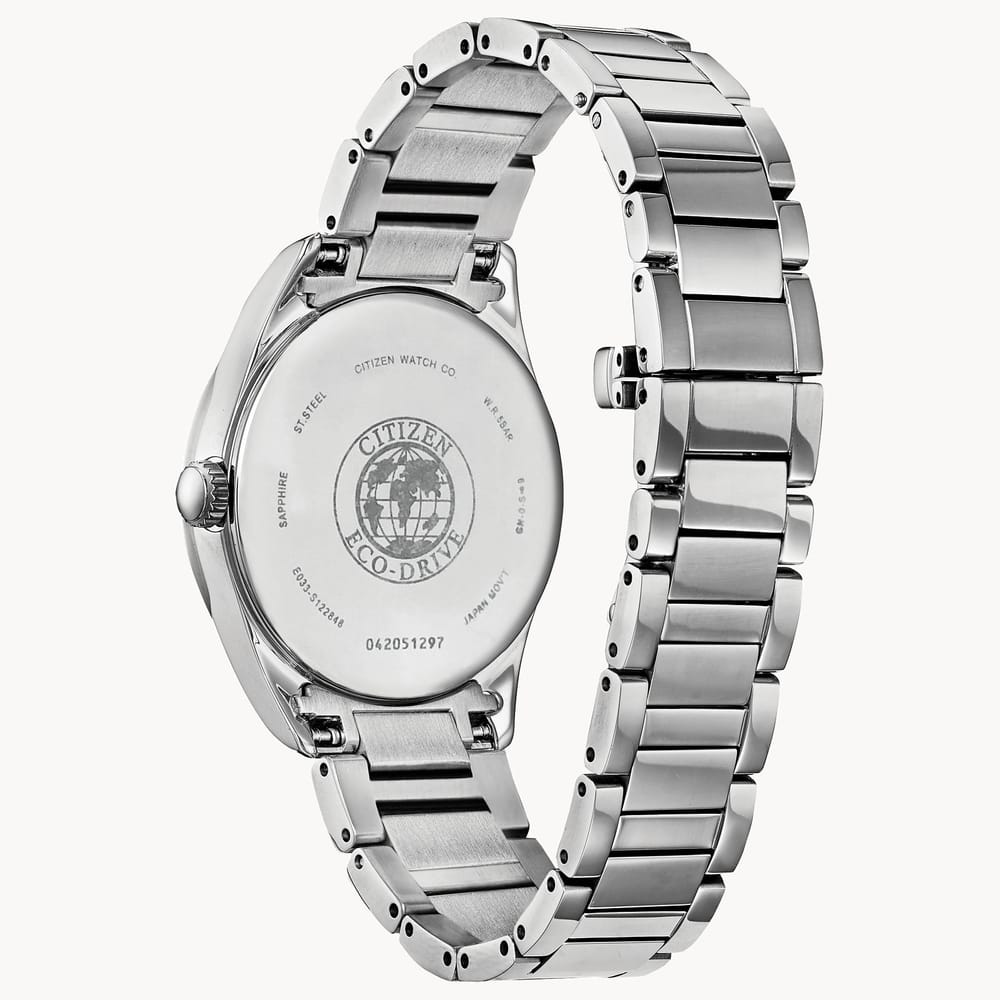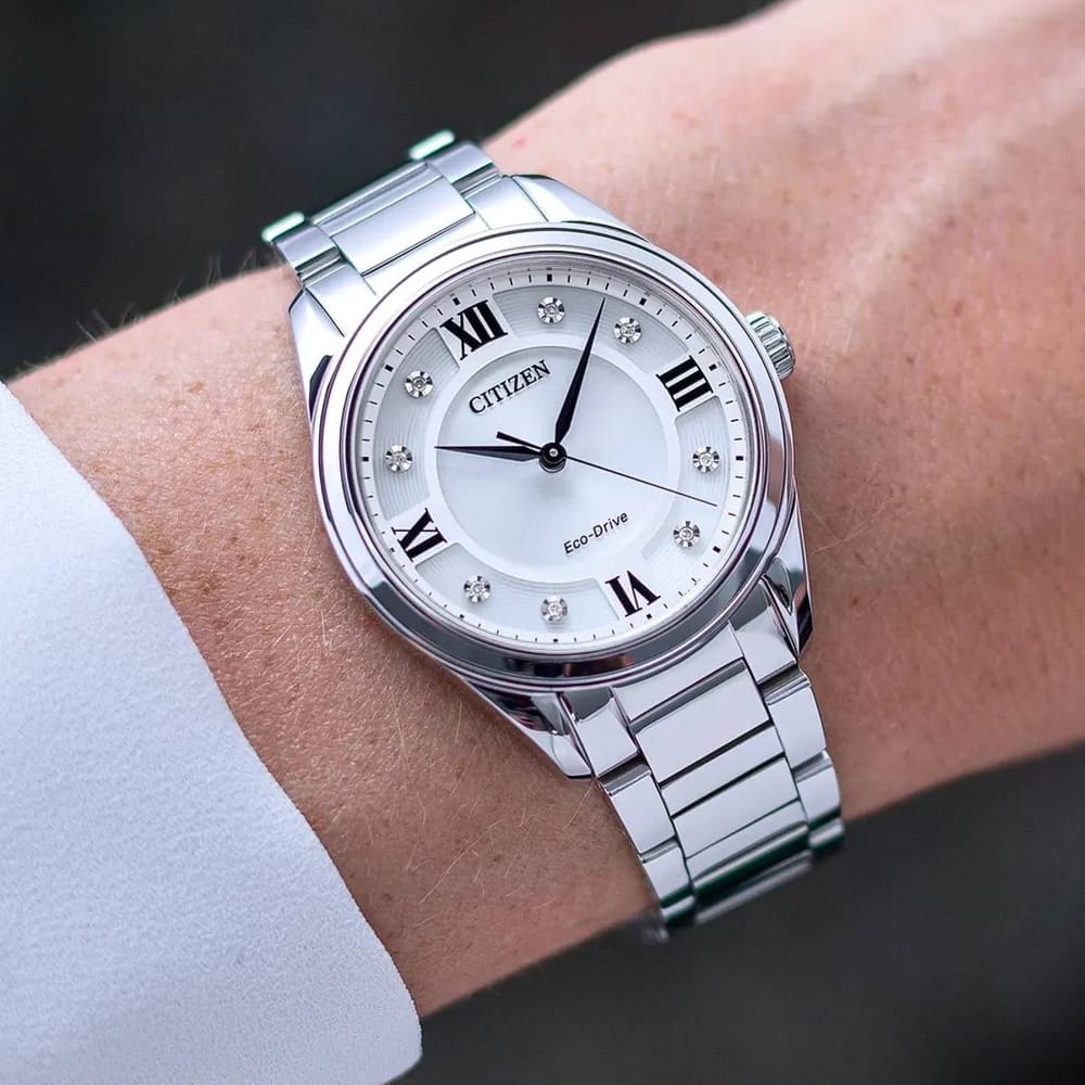 It has a stainless-steel bracelet with a deployment clasp and the slightly oversized, 32mm, stainless-steel case features a three-hand silver-tone dial, Roman numerals with a diamond accent. The watch also uses Eco-Drive technology, meaning it is powered by light — any light — and will never need to be recharged.